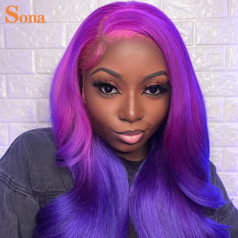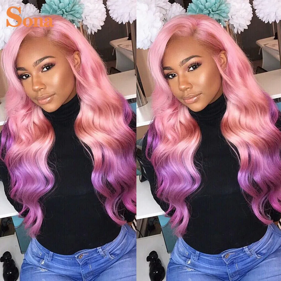 Фиолетовые фронтальные парики с эффектом омбре, волнистые бразильские волосы без повреждения кутикулы, 2 оттенка, цветные, розовые, красные, светлые человеческие волосы, парики для женщин