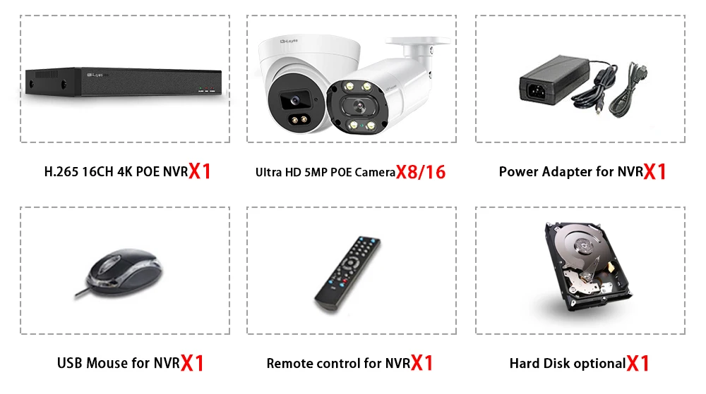 1 сетевой видеорегистратор 16CH 4K POE NVR;8/16 X HD POE IP 5.0MP Крытый Открытый ИК День ночного видения атмосферостойкие камеры;1 X Блок питания для NVR;1 х USB мышь для NVR;1 компакт-диск программного обеспечения для NVR;1 пульт дистанционного управления для NVR;Жесткий диск опционально!