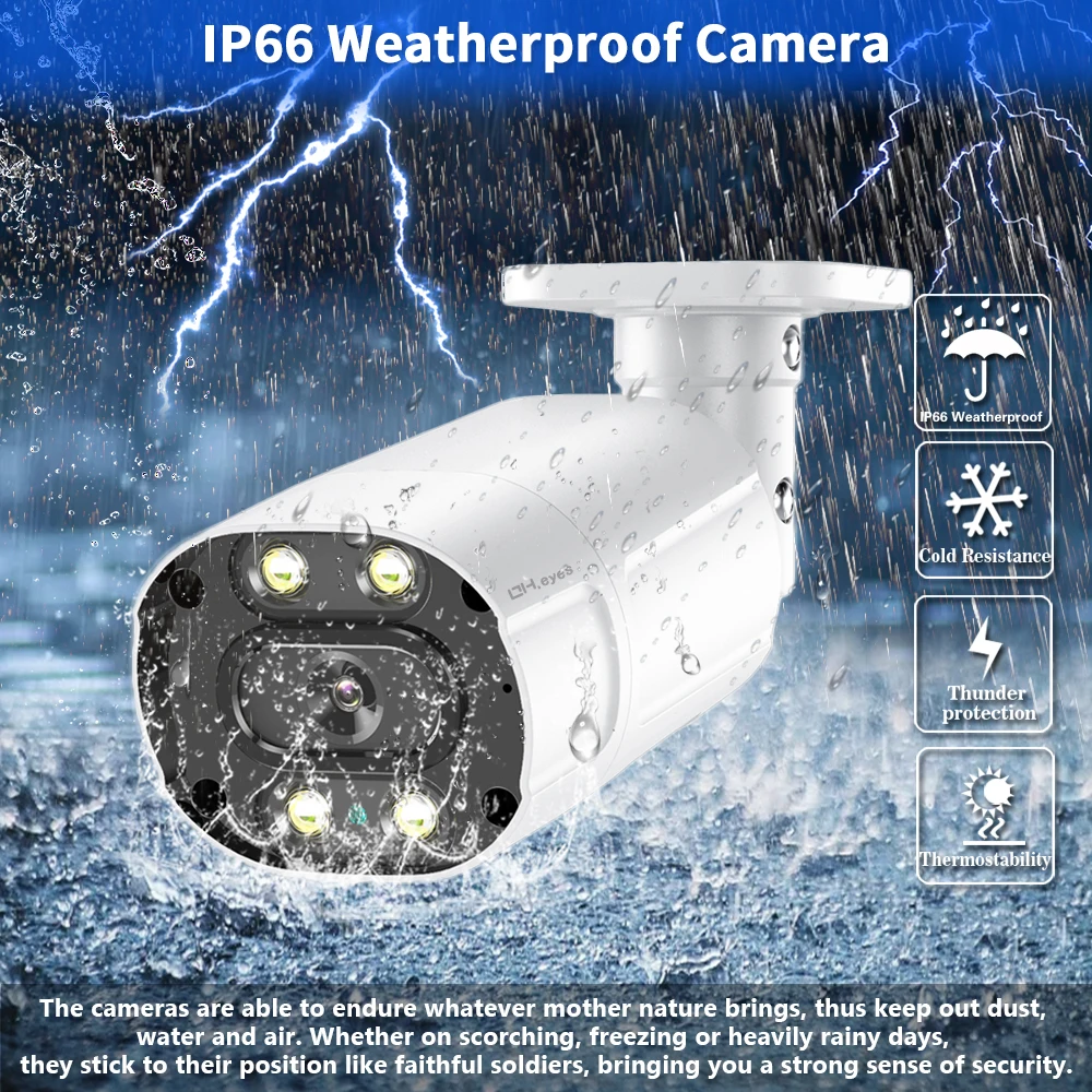 Используйте их в качестве наружных камер или внутренних камер, так как они построены жестко, чтобы выдерживать любую погоду: дождь, снег, пыль и жаркие дни. С защитой от атмосферных воздействий IP66 и кабелями, проходящими через подставку для дополнительной защиты, гарантируем, что вы сможете ответить на их производительность, день в день. Наша камера имеет сверхпрочный металлический корпус, профессиональный IP66, устойчивый к атмосферным воздействиям, обеспечивая стабильную производительность как внутри, так и снаружи.