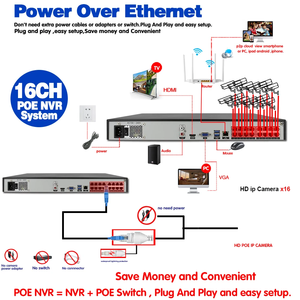 Нет дополнительных кабелей питания или адаптеров, просто подключив ip-камеру к NVR с помощью одного кабеля, вы можете легко завершить установку без знания о компьютере или сети и начать наслаждаться супер простым мониторингом среди вашего смартфона, планшета или ПК.Экономьте деньги и удобный POE NVR = NVR + POE коммутатор, подключи и работай и простая настройка!