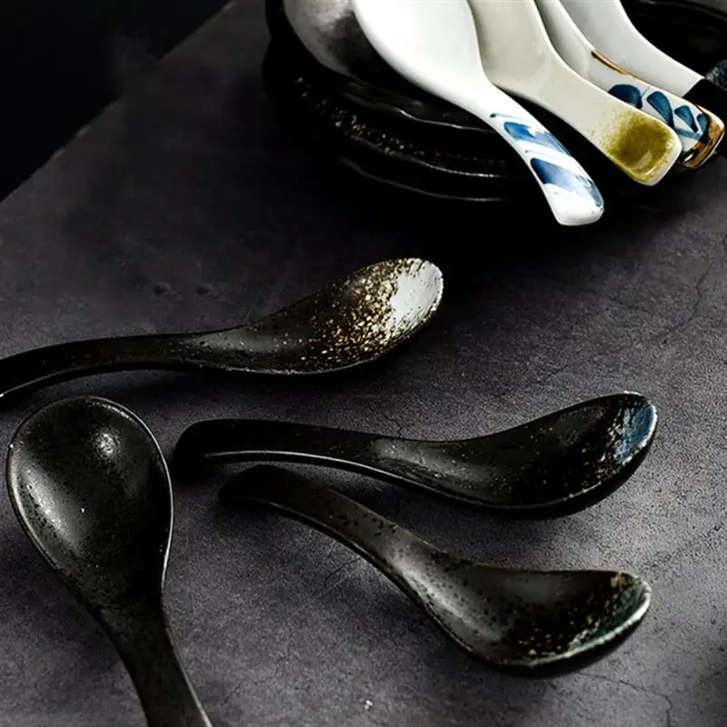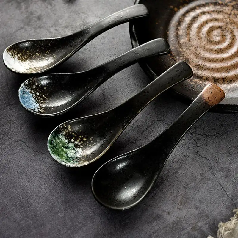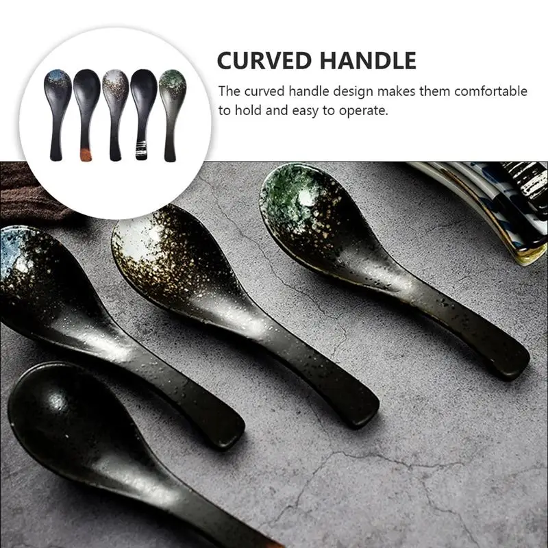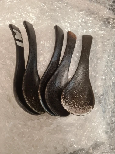 I received two of the same spoons (missing the one where the handle is a brownish tan) but I don't mind at all. However, the surface feels bumpy where the glaze is speckled/painted, which is also not a big deal, but I would have preferred a smoother glaze. Over all, beautiful pieces that I will be happy to use.