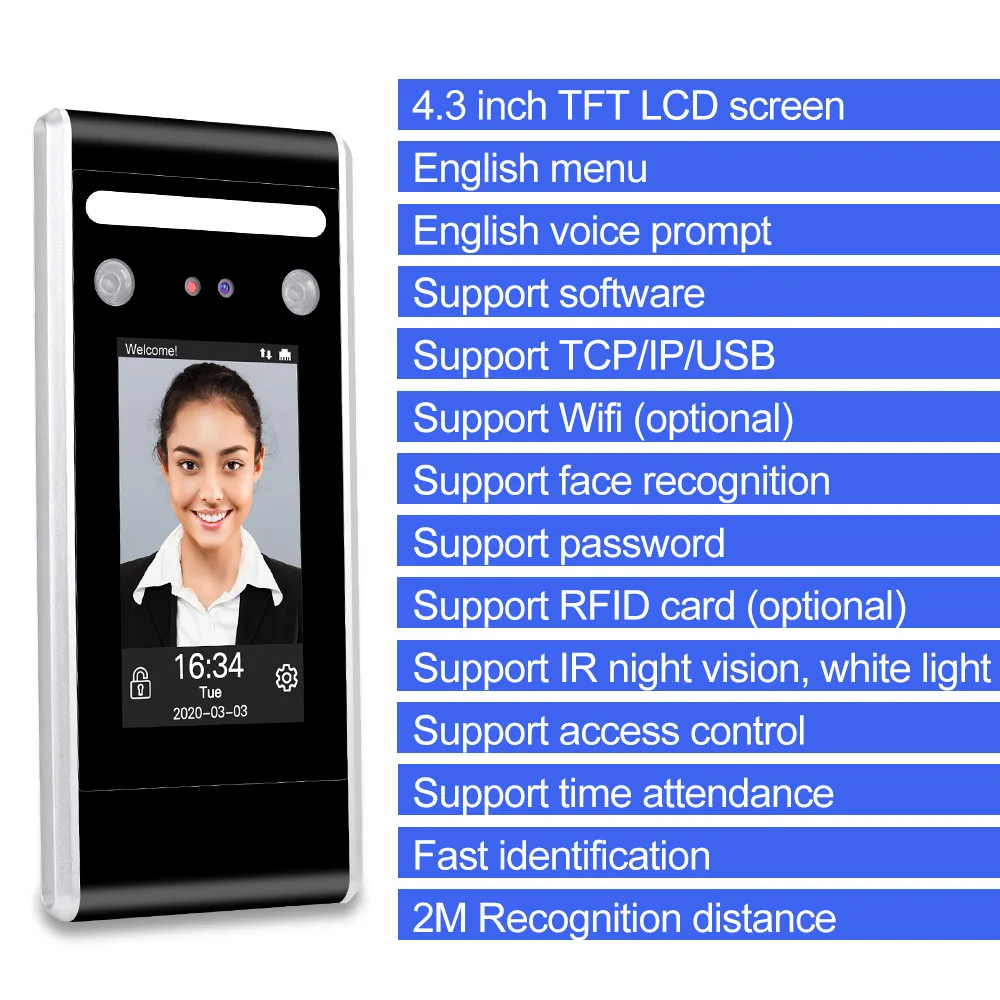 1) 4,3 дюймов TFT ЖК-дисплей Цвет экран. Изготовлен из высококачественного материала.2) работает с DC12V, будет поставляться штепсельная Вилка питания DC12V.3) имеет инфракрасный светильник ночного видения с высоким разрешением и профессиональную цветную Двойная камера, может осуществлять быструю проверку в любой среде.4) Двойной светильник (2 инфракрасные лампы + белый светильник). Можно распознать даже в темноте.5) 0,1 s скорость идентификации, очень быстро! Поддержка уход за кожей лица расстояние обнаружения 0,5-2 метра.6) работает с частотой 125 кГц и 13,56 МГц. Поддержка карт EM и Mi-fare.7) Поддержка 2000 лицевых, 2000 паролей, 2000 RFID карт (опционально), 200000 емкость записи.8) поддерживает лицо, пароль, RFID карту и различные комбинированные методы, чтобы удовлетворить требования различных пользователей. (опционально)9) T9 входной метод редактора, на имя машины, отдел, частоту и другую информацию, может быть непосредственно выводит отчеты о посещаемости, очень прост в эксплуатации.10) Поддержка WIFI / TCP/ IP метода связи. Поддержка USB флеш-накопителя загрузка данных посещаемости. (Опционально)11) имеет Wiegand26/34 вход/выход, TTL вход/выход, релейный выход12) Поддержка английского меню и гуманизированная Голосовая подсказка.13) нормально распознает даже при ношении маски. Нельзя распознавать с помощью фотографий или видео.14) подходит для входов и выходов из офиса, фабрики, отеля, школы и т. д.