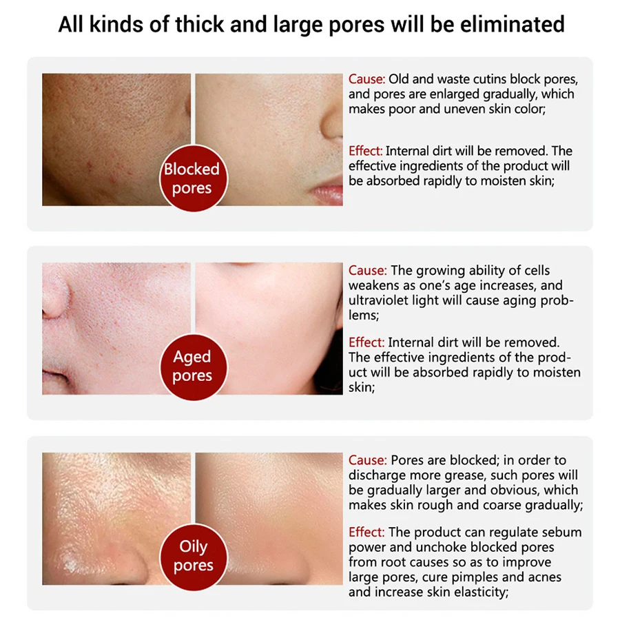Заблокированные порыПричина: старые и расточительные срезы блокируют поры, а поры постепенно расширяются, что приводит к плохому и неравномерному цвету кожи;Эффект: Внутренняя грязь удаляется. Эффективные ингредиенты средства быстро впитываются для увлажнения кожи;Состаренные порыПричина: растущая активность клеток ослабевает по мере увеличения одного шалфея, а ультрафиолетосветильник ение вызовет старение проб-лемов;Эффект: Внутренняя грязь удаляется. Эффективные ингредиенты прод-uct быстро впитываются для увлажнения кожи;Жирные порыПричина: поры заблокированы; Для выделения большего количества жира такие поры будут постепенно больше и заметны, что постепенно делает кожу грубой и грубой;Эффект: средство регулирует силу кожного сала и блокирует поры от первопричин, улучшая большие поры, вылечивая прыщи и акне и повышая эластичность кожи