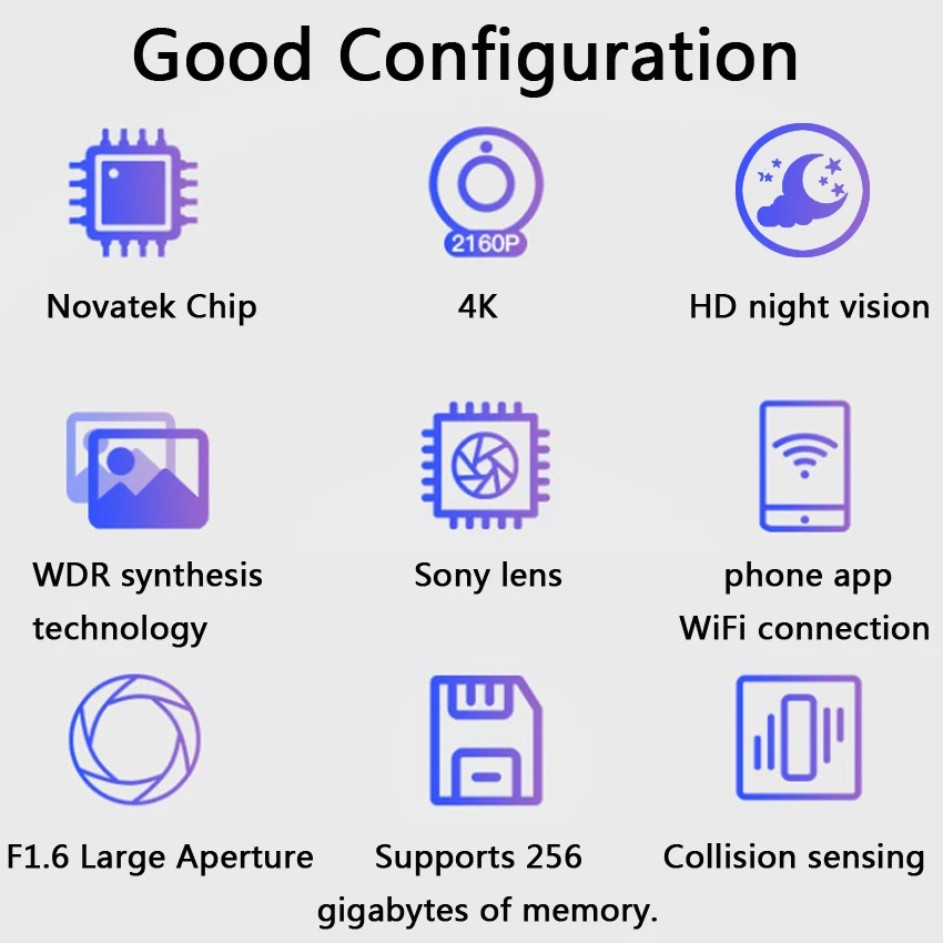 2160p full hd скрытая Wifi камераОбновленный процессор novatek 96670 415 Sony lens делает запись очень гладкой и высокой четкости, Попрощавшись с утечкой карт crashand.Максимальная поддержка 256G TF картыНа 30% больше, чем предыдущее поколение