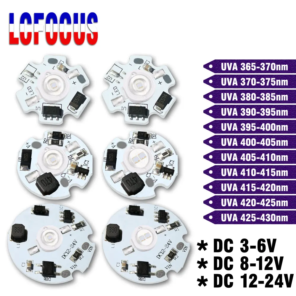 DC 12В 24В УФ фиолетовый светодиодный чип UVA 365 нм 370нм 375нм 380нм 385нм 395нм 400нм 405нм 410нм 420нм 425нм COB ультрафиолетовые лампы 3 Вт 5 Вт