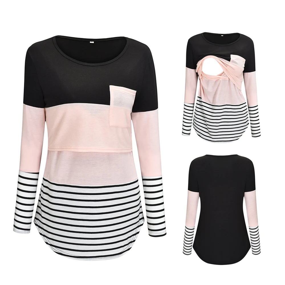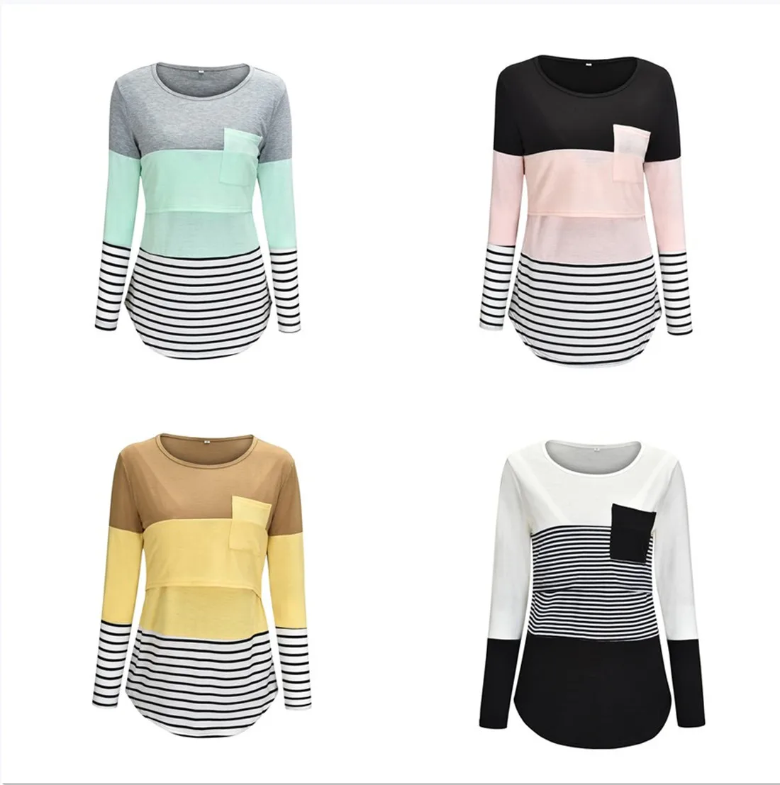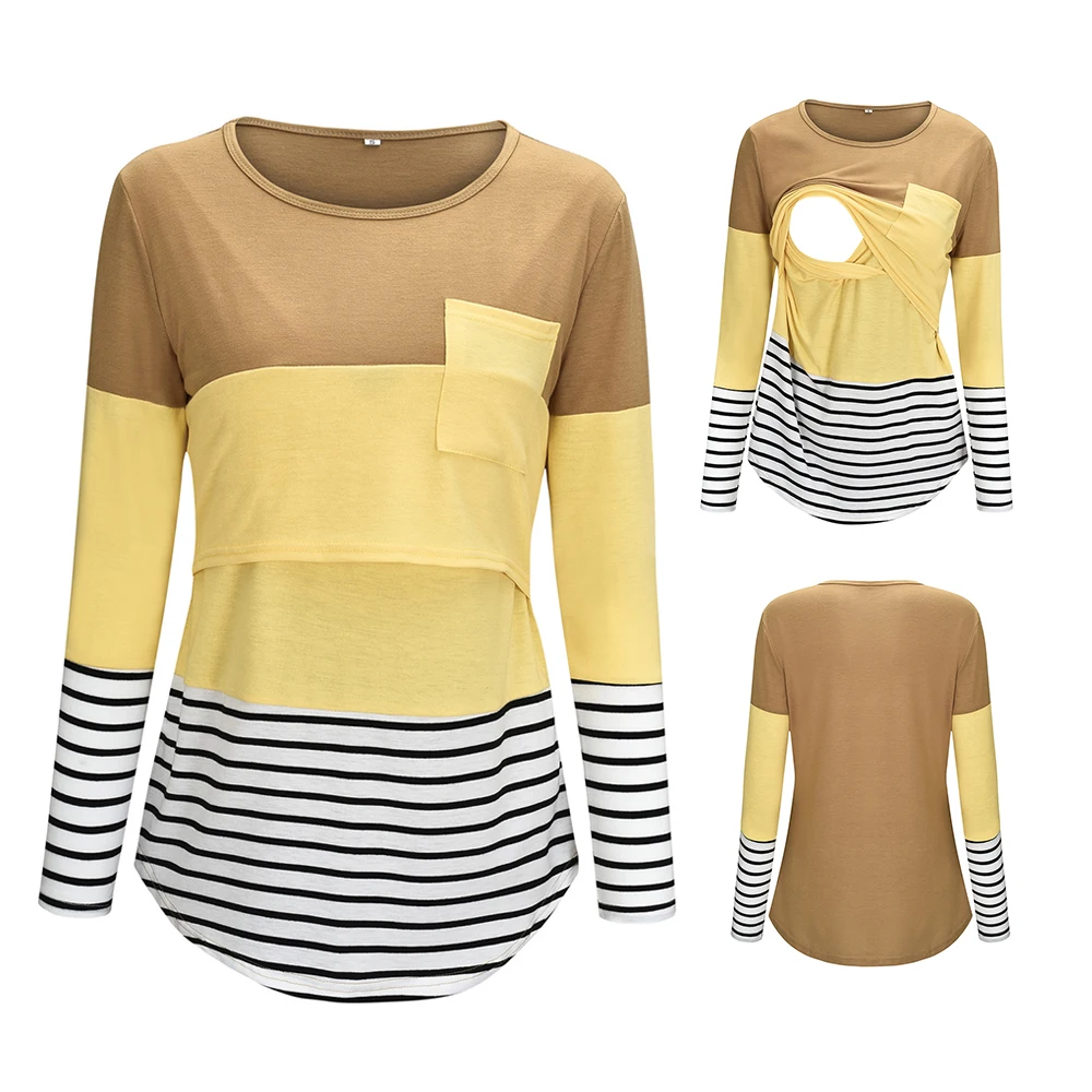 Топы для беременных женщин для грудного вскармливания полосатые простроченные с длинным рукавом модные футболки для беременных Одежда для кормления рубашки