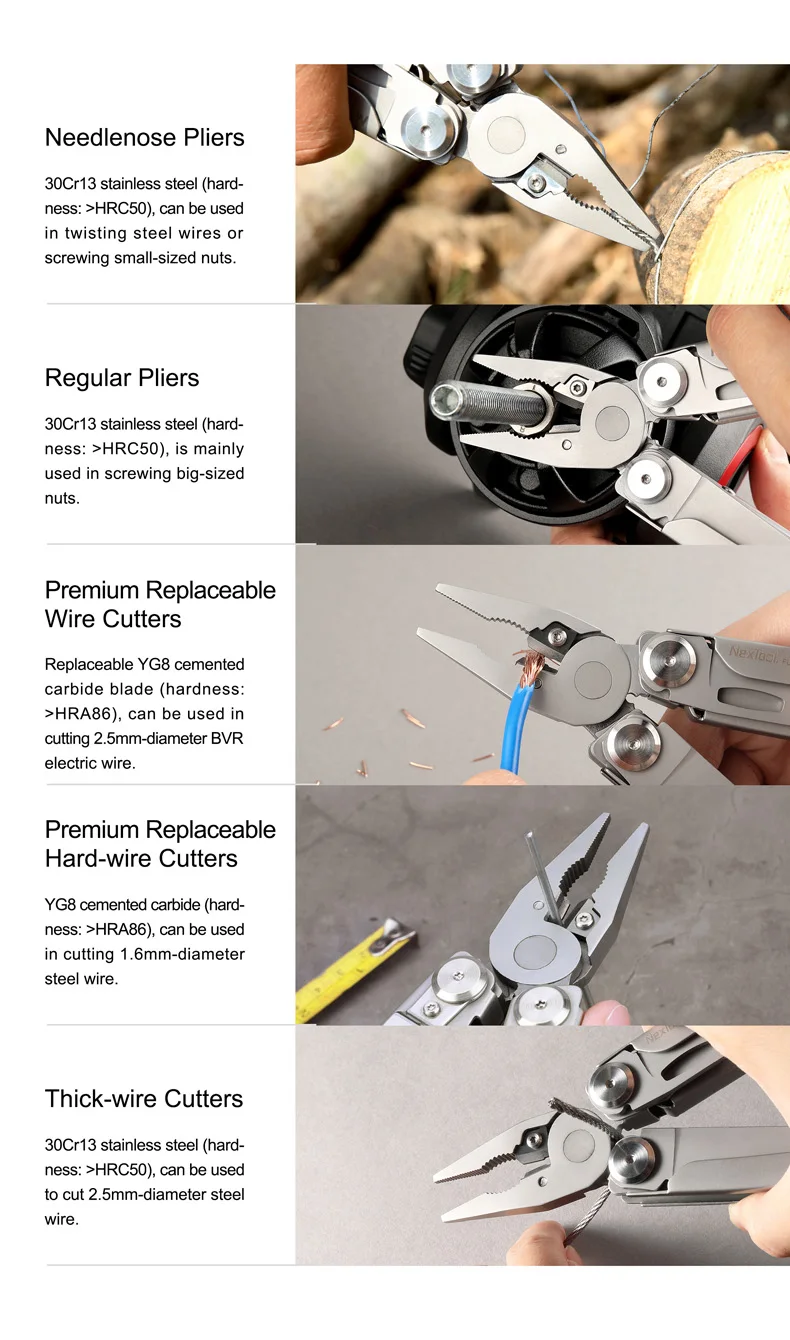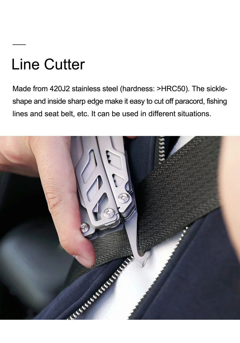 ● Плоскогубцы, главный резак, ножницы, деревянная пила, открывалка для бутылок, консервный нож, твердость основных функциональных частей резака больше HRC50, с сильной силой резания и резкостью долговечности, износостойкостью.
