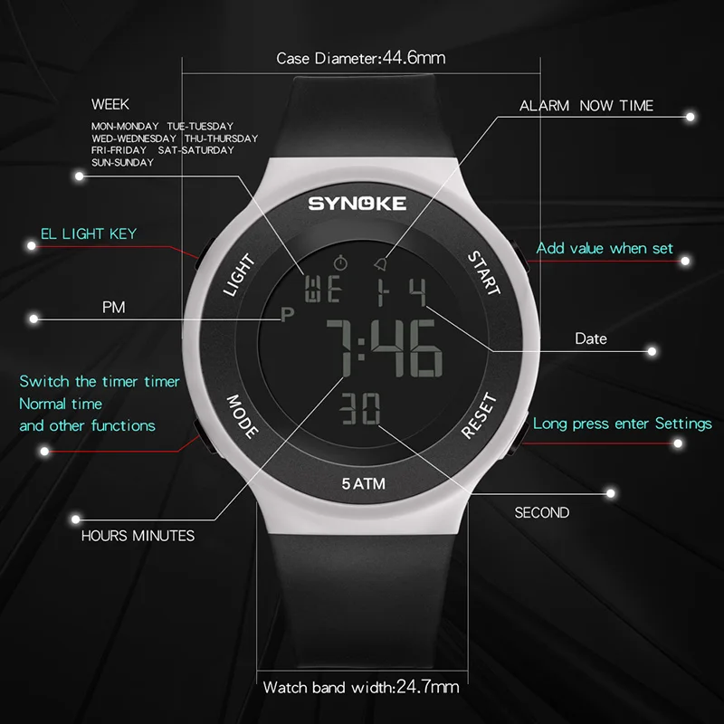Часы наручные SYNOKE мужские светодиодные, водонепроницаемые спортивные цифровые, со съемным ремешком, с сигнализацией, 50 м