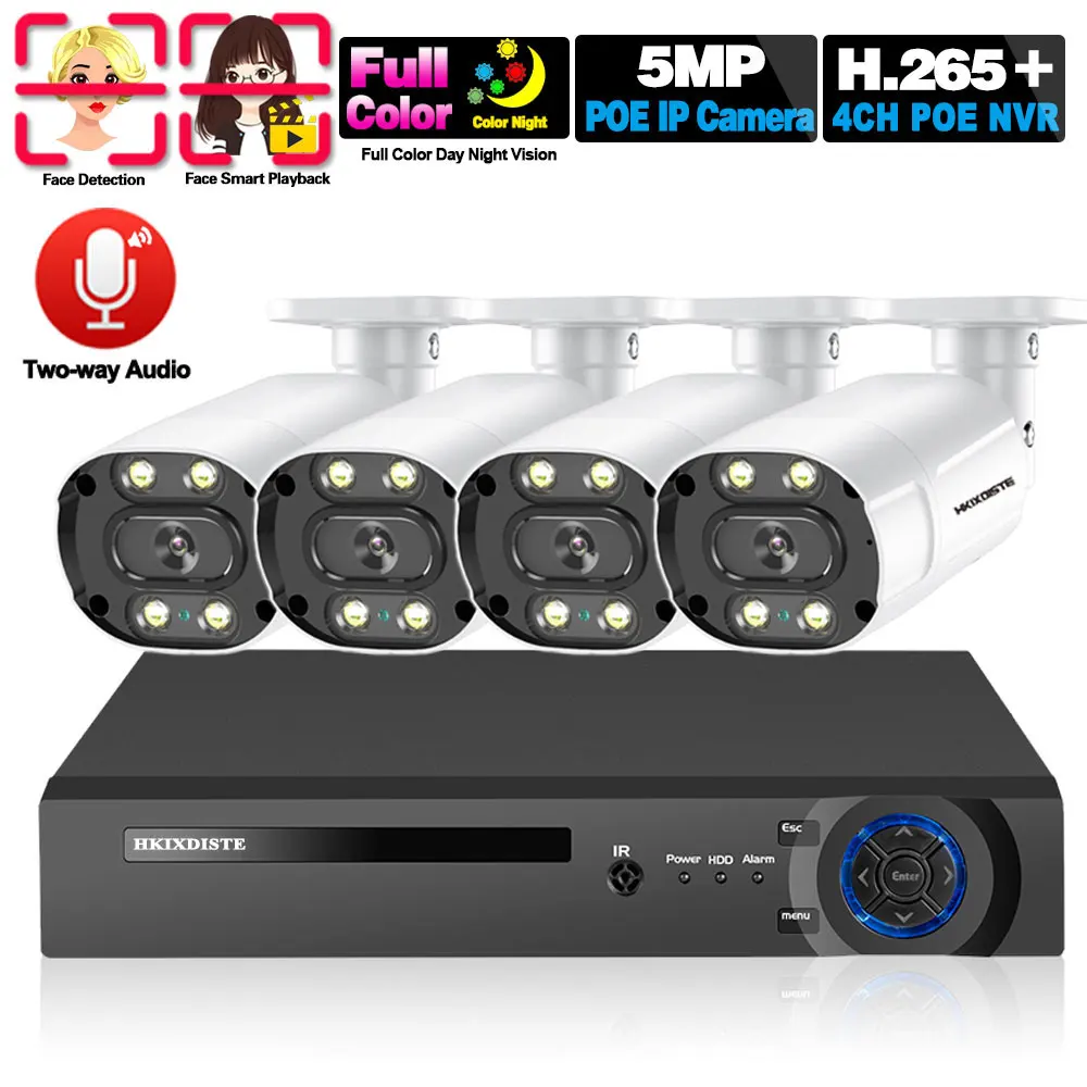 Двухстороннее аудио распознавание лица H.265 4CH 5MP POE NVR комплект CCTV система безопасности аудио AI POE IP камера наружный комплект видеонаблюдения