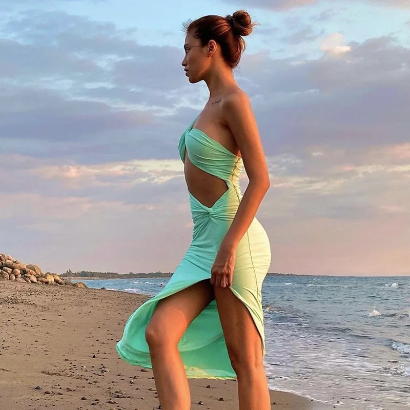 Модное сексуальное платье-миди Vhaferl с разрезом, женские летние платья 2021 с рюшами и открытой спиной, зеленые вечерние Клубные платья