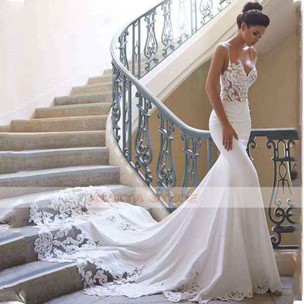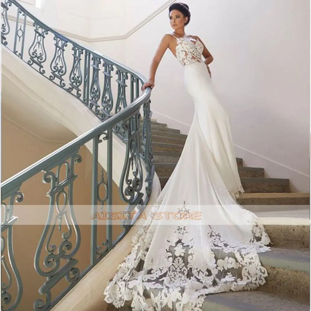 Женское свадебное платье с юбкой-годе, винтажное платье с кружевной аппликацией и открытой спиной, со шлейфом, 2020