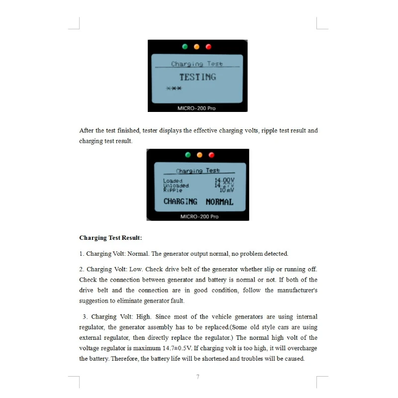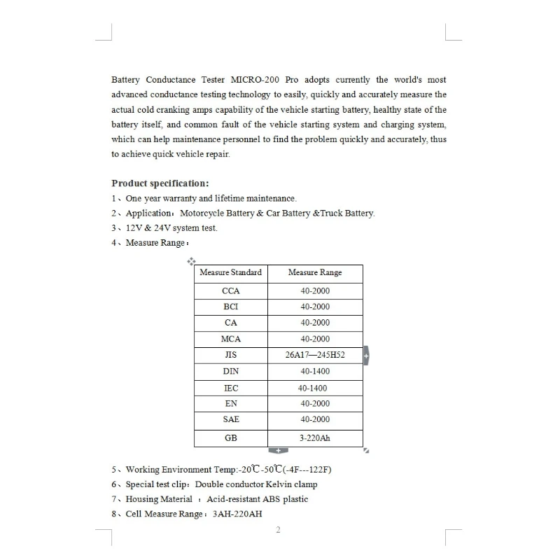 OOTDTYОписание:100% новый и высококачественныйОсобенности:Обычные автомобильные аккумуляторы 12 В и мотоциклетные аккумуляторы 12 В, тестирование систем аккумуляторов 12 В и 24 В.Тест системы зарядки, тест запуска системы.Индикатор состояния батареи показывает.Подключите usb-кабель к компьютеру для печати результатов тестирования.Обычная батарея, AGM батарея, EFB батарея, гелевая батарея и другие тесты.Технология проводимости, удобное, быстрое и точное тестирование.Только Тестер, другие демонстрационные аксессуары на картинке в комплект не входят.Спецификация:Модель: MICRO-200 PROДиапазон Измерение напряжения: 7-30 В постоянного токаДиапазон измерения: 40-2000CCA. 3-220ач.Для тестирования аккумуляторов 12 В.Для тестирования систем зарядки 12 и 24 ВСветодиодное освещение три состояния: хороший (зеленый) слабый (желтый) заменить (красный)Тип тестовой батареи: все свинцово-кислотные стартерные батареи (свинцово-кислотные, EFB, AGM, GEL...)Технология: техника проводимостиТемпературные условия: рекомендуемый рабочий диапазон-18 ℃ ~ + 70 ℃ в температуре окружающей средыМатериал крышки: кислотостойкий АБС-пластикДопуск: CCA<± 10; Напряжение ± 0.5%Специальный тестовый зажим: двухжильный кельвиновый зажимСпецификация:Тип: тестер автомобильного аккумулятораМатериал: АБСОсобенности: тестер автомобильных аккумуляторов, цифровой анализатор емкости, сброс нагрузки системный анализатор, ремонт, расходные материалыРазмер: около 14 см/5,51 дюймаЦвет: черныйКоличество: 1 шт.Примечание:1. Возможны отклонения в 0-1 см из-за ручного измерения. Пожалуйста, убедитесь, что вы не против, прежде чем сделать заказ.2. В связи с разной конфигурацией разных мониторов изображение не отображает фактический цвет товара. Спасибо!Посылка входит:1 шт. х тестер автомобильного аккумулятора