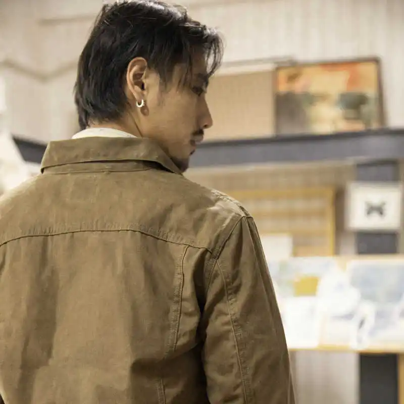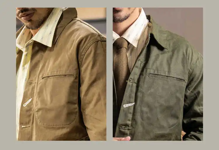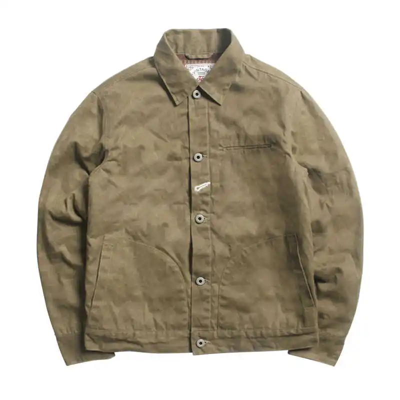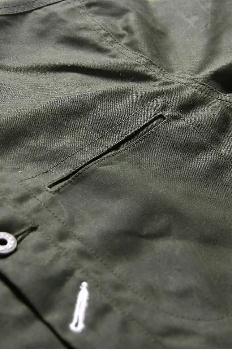 ⑥ Вощеный хлопковый холст 100%, водоотталкивающий ⑥ Подкладка из смесовой шерсти делает куртку идеальной для холодной погоды ⑥ Два внешних накладных кармана на талии ⑥ Прорезной левый нагрудный карман ⑥ Внутренний правый нагрудный карман ⑥ Манжеты на пуговицах ⑥ Облегающие и короткие, мы рекомендуем заказывать на один или два размера больше, чем обычно ⑥ Только для очистки пятен