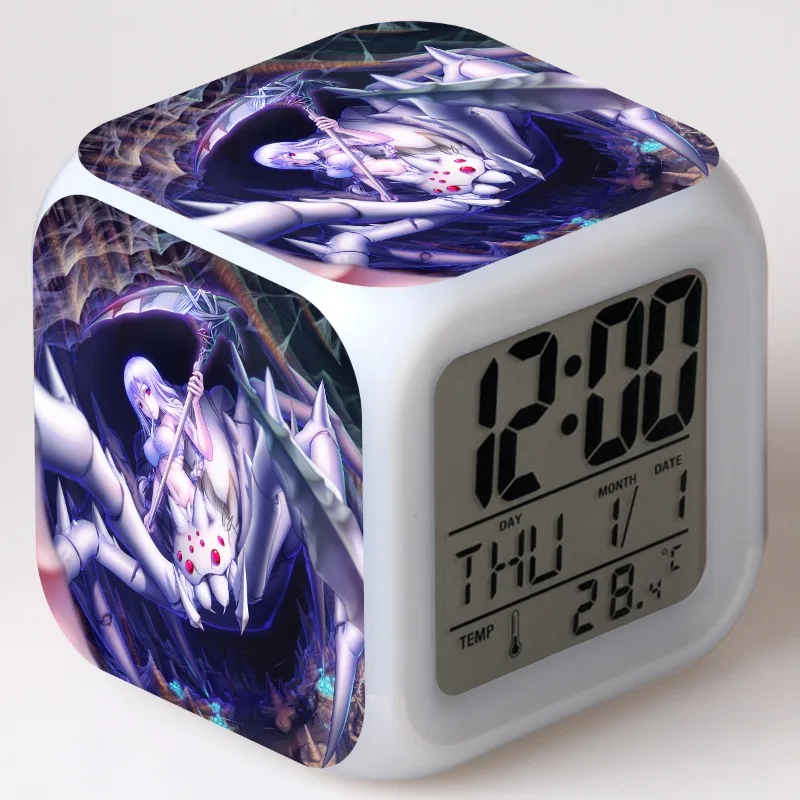 Наименование товара: будильник Характеристика: Цветной сенсорный светильник Материал: пластикДизайн: Kumo Desu ga Nani ka НаклейкиРазмер: 8*8*8 смДисплей: Отображение времени недели и температуры
