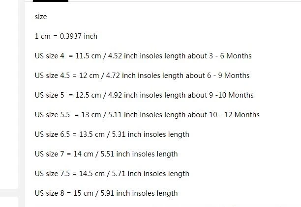 Размер 1 см = 0,3937 дюйма Американский размер 4 = 11,5 см/4,52 дюймов длину стельки примерно, для детей от 3 до 6 месяцев Американский размер 4,5 = 12 см/4,72 дюймов стельки длина около 6 - 9 месяцев Американский Размер 5 = 12,5 см/4,92 дюймов длину стельки для детей; Размер на 9 -10 месяцев Американский размер 5,5 = 13 см/5,11 дюймов стельки длиной около 10 - 12 месяцев Американский размер 6,5 = 13,5 см/5,31 дюймов длину стельки Размер США 7 = 14 см/5,51 дюйма длина стельки Американский размер 7,5 = 14,5 см/5,71 дюймов длину стельки Американский Размер 8 = 15 см/5,91 дюймов длину стелькиАмериканский размер 8,5 = 15,5 см/6,11 дюймов длину стельки