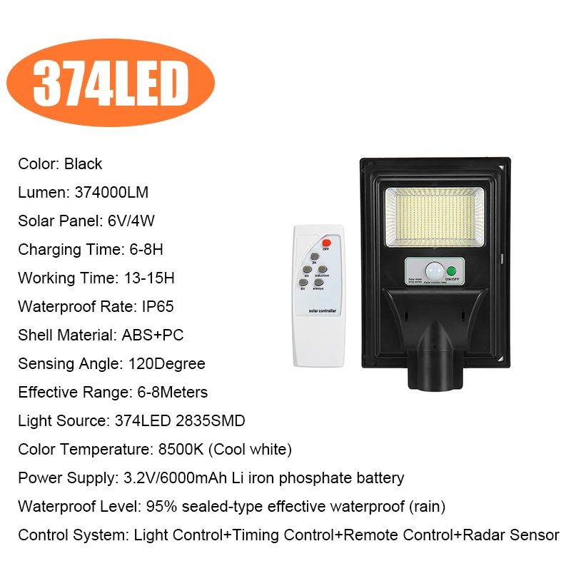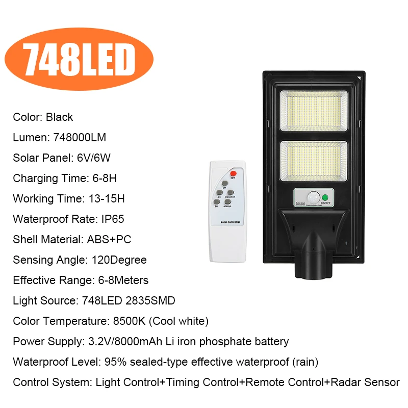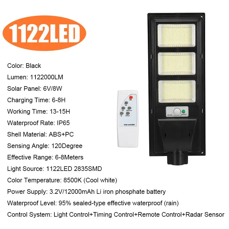 100 Вт 347LED:Цвет: черныйЛюмен: 374000 лмСолнечная панель: 6 В/4 ВтВремя зарядки: 6-8 чВремя работы: 13-15 чСтепень водонепроницаемости: IP65Материал корпуса: абс + ПКУгол срабатывания: 120 градусовЭффективный диапазон: 6-8 метровИсточник светильник: 374LED 2835SMDЦветовая температура: 8500K (холодный белый)Источник питания: литий-железо-фосфатный аккумулятор 3,2 В/6000 мАчУровень водонепроницаемости: 95% герметичная Водонепроницаемость (дождь)Система управления светильник + таймер + пульт дистанционного управления + радар-датчик200 Вт 748LED:Цвет: черныйЛюмен: 748000лмСолнечная панель: 6 В/6 ВтВремя зарядки: 6-8 чВремя работы: 13-15 чСтепень водонепроницаемости: IP65Материал корпуса: абс + ПКУгол срабатывания: 120 градусовЭффективный диапазон: 6-8 метровИсточник светильник: 748LED 2835SMDЦветовая температура: 8500K (холодный белый)Источник питания: литий-железо-фосфатный аккумулятор 3,2 В/8000 мАчУровень водонепроницаемости: 95% герметичная Водонепроницаемость (дождь)Система управления светильник + таймер + пульт дистанционного управления + радар-датчик300 Вт 1122LED:Цвет: черныйЛюмен: лмСолнечная панель: 6 В/8 ВтВремя зарядки: 6-8 чВремя работы: 13-15 чСтепень водонепроницаемости: IP65Материал корпуса: абс + ПКУгол срабатывания: 120 градусовЭффективный диапазон: 6-8 метровИсточник светильник: 1122LED 2835SMDЦветовая температура: 8500K (холодный белый)Источник питания: литий-железо-фосфатный аккумулятор 3,2 В/12000 мАчУровень водонепроницаемости: 95% герметичная Водонепроницаемость (дождь)Система управления светильник + таймер + пульт дистанционного управления + радар-датчик400 Вт 1496 светодиодов:Цвет: черныйЛюмен: 1496000 лмСолнечная панель: 6 В/12 ВтВремя зарядки: 6-8 чВремя работы: 13-15 чСтепень водонепроницаемости: IP65Материал корпуса: абс + ПКУгол срабатывания: 120 градусовЭффективный диапазон: 6-8 метровИсточник светильник: 1496LED 2835SMDЦветовая температура: 8500K (холодный белый)Источник питания: литий-железо-фосфатный аккумулятор 3,2 В/15000 мАчУровень водонепроницаемости: 95% герметичная Водонепроницаемость (дождь)Система управления светильник + таймер + пульт дистанционного управления + радар-датчикПрименение:-Наружная стена или шест на площади, парке, саду, дворе, улице, дорожке, тропинке, кампусе, ферме, безопасности по периметру и т. д.Посылка1 солнечный уличный фонарь1 х пульт дистанционного управленияПримечание:* Пожалуйста, включите переключатель перед установкой и зарядкой.* Пожалуйста, выберите место без укрытия для достаточного солнечного света и полного воздействия.
