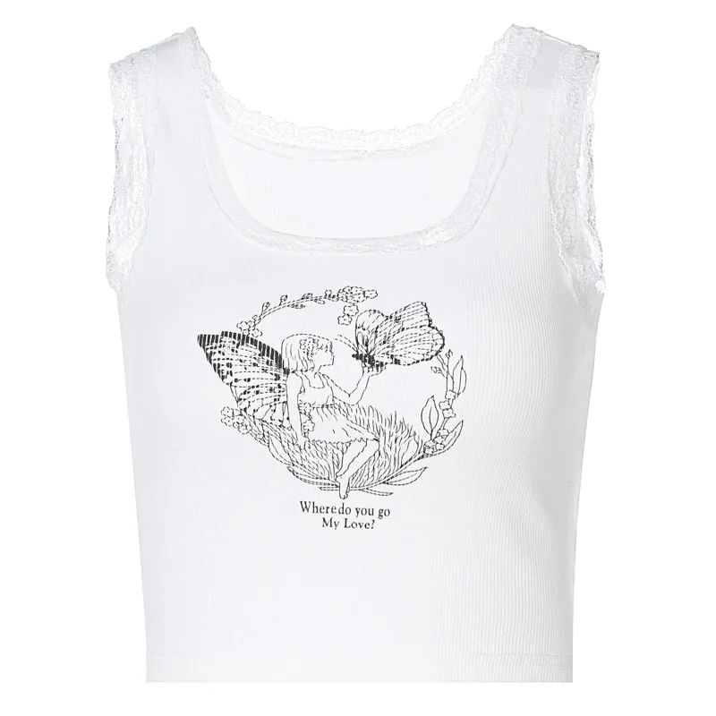 Укороченный белый топ с кружевной отделкой и принтом, Волшебная лет...