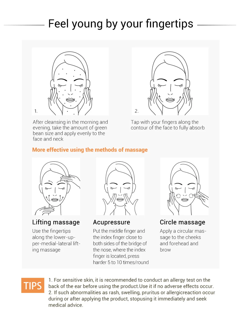 1. Для чувствительной кожи рекомендуется перед использованием продукта провести тест на аллергию на тыльной стороне уха. Используйте его, если не произошло неблагоприятных эффектов.