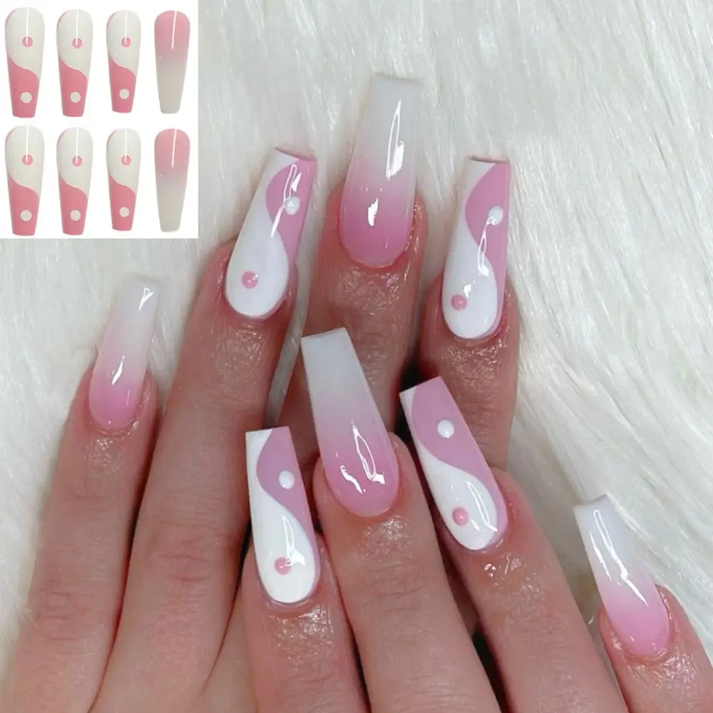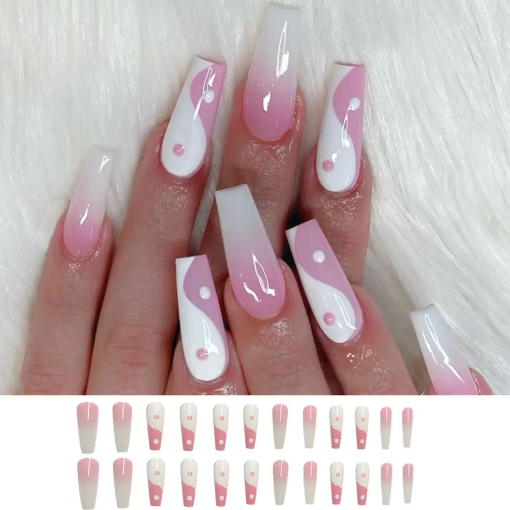 24 шт., розовые накладные ногти с рисунком Taiji, Длинные накладные ногти для гроба, накладные ногти для балерины, ногти для дизайна ногтей с клеем