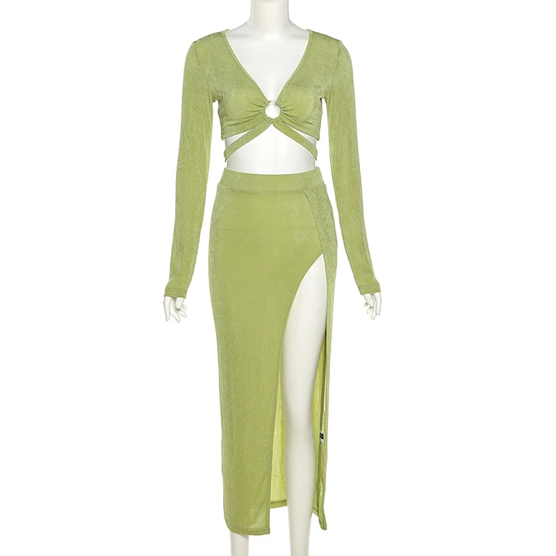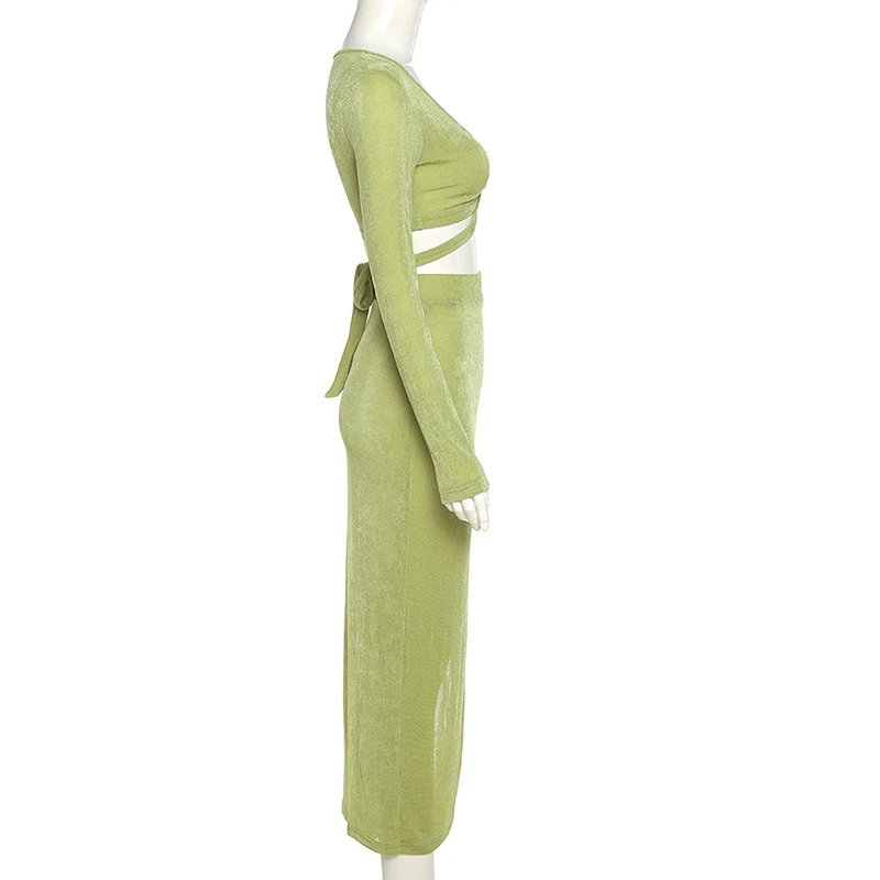 Женский комплект из двух предметов, Зеленый Топ с длинным рукавом и разрез с высокой талией, осенний наряд для вечеринки, костюмы с длинной юбкой