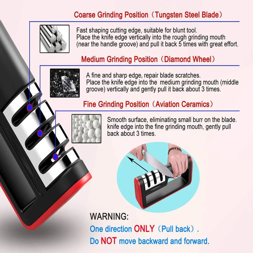 Наслаждайтесь преимуществами длительного срока службы Резкость для того, чтобы ваши ножи с 3-ступенчатый нож системой заточки. С нашей невероятной 3-слот-система, Мы революционизируем искусство заточки ножей! Первый алмаз Точильный стержень восстанавливает и выпрямляет поврежденные лезвия до 2 Слот Затачивает, чтобы восстановить его v-образную форму. Наконец, 3-й слот Чистая полировка.