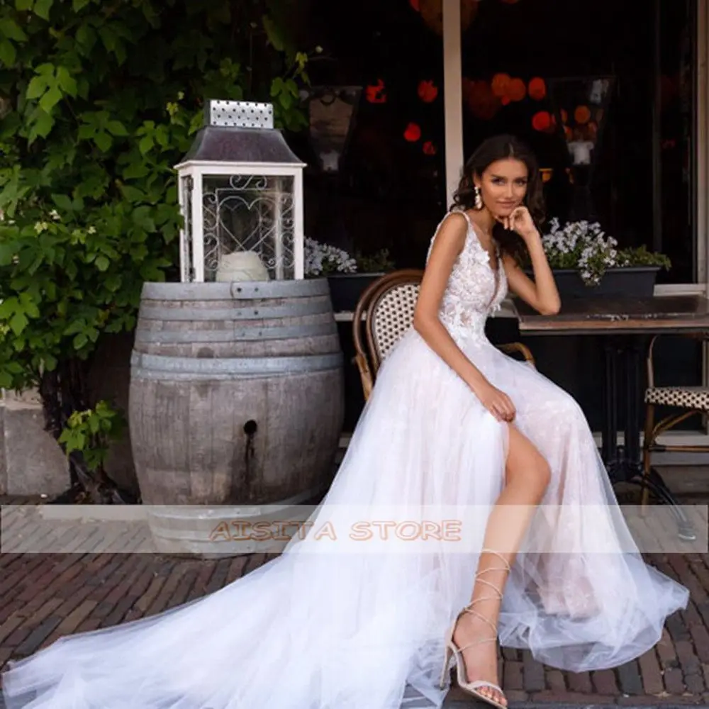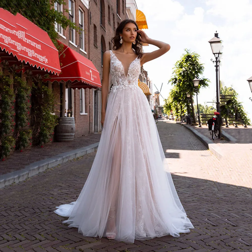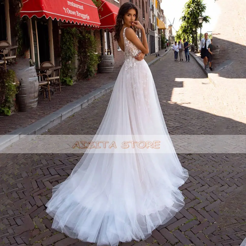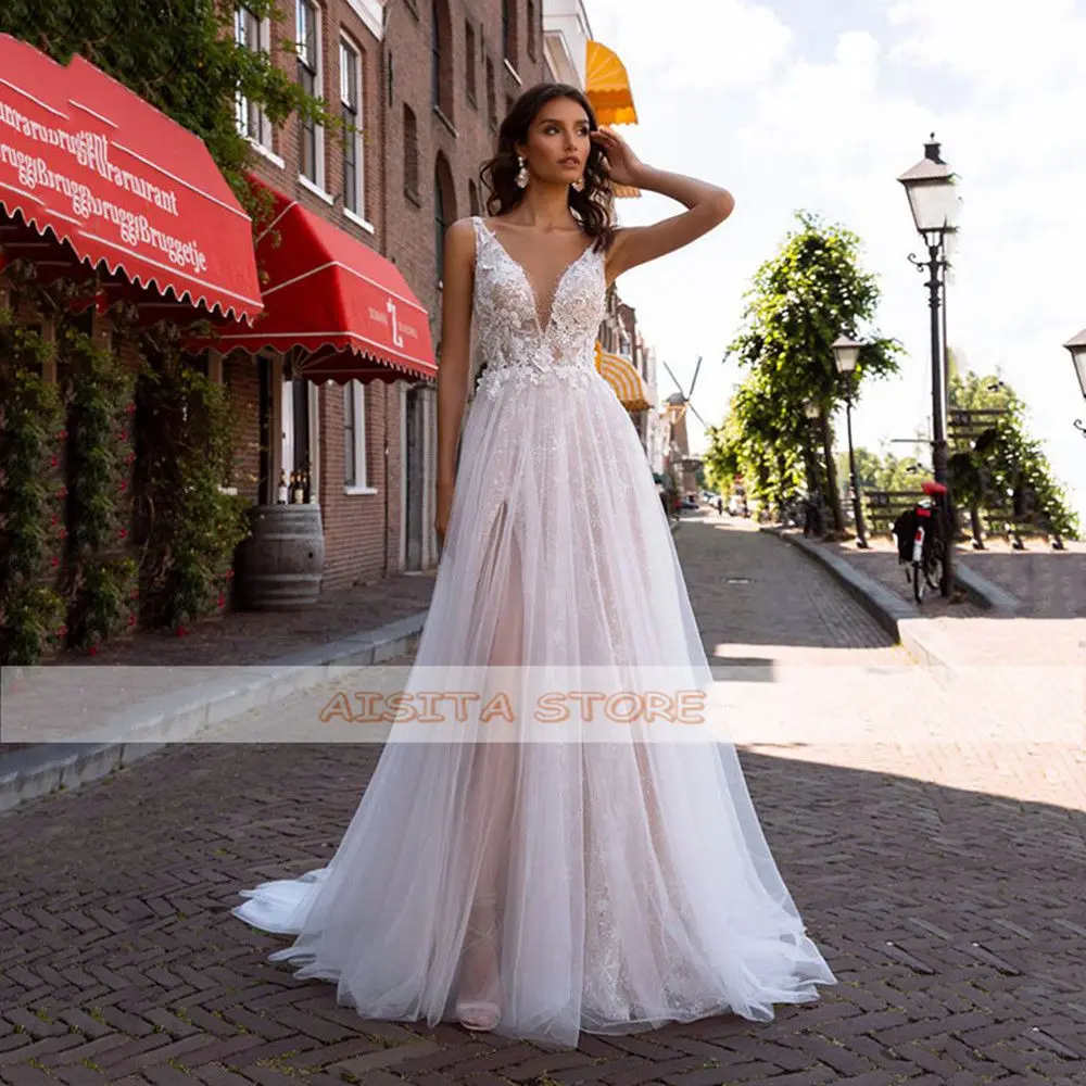 Женское свадебное платье, винтажное кружевное платье-трапеция без рукавов с V-образным вырезом и открытой спиной, платье невесты, 2022