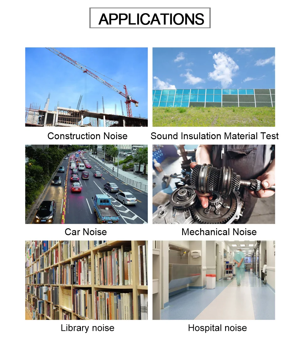 Измеритель уровня звука широко используется в шуме инженерных работ, контроля качества, здравоохранения и других экологических измерений. Например, наука и промышленность. Применение включено в дома, офисы, школьные предприятия, дорожное строительство и т. Д.