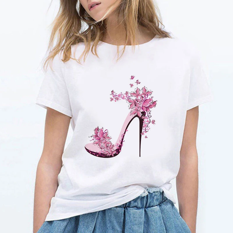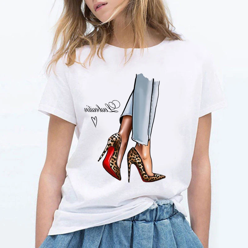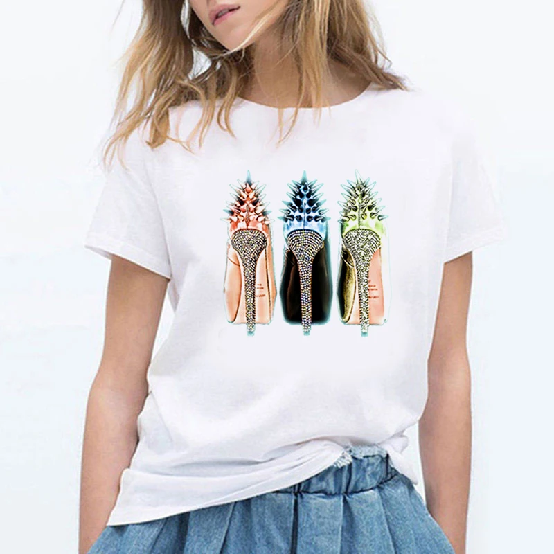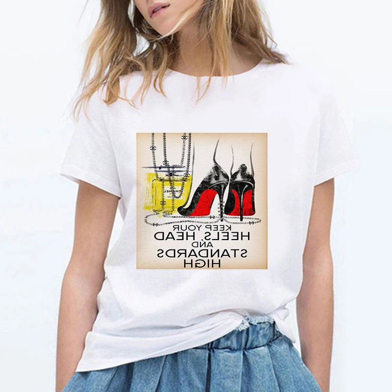 Футболка женская оверсайз, модная рубашка с принтом туфель на высоком каблуке, уличная одежда с коротким рукавом, одежда на лето