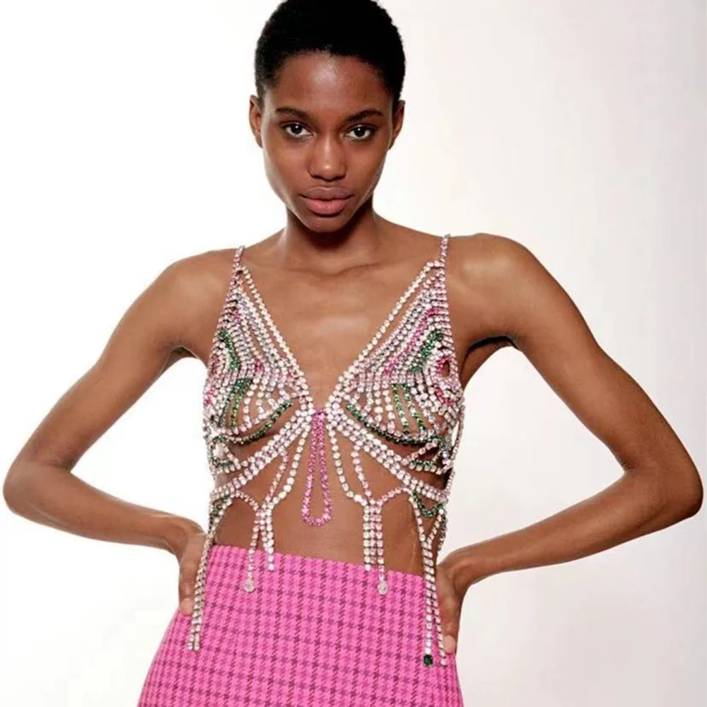 Роскошная цепочка стразы в форме большой бабочки, бюстгальтер, ожерелье, украшения для тела для женщин, блестящий бюстгальтер с кристаллами, цепочка для груди, бикини