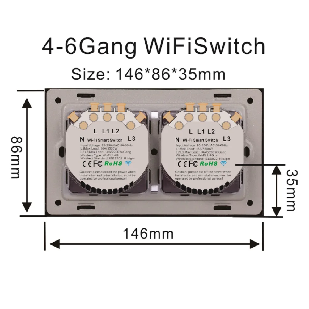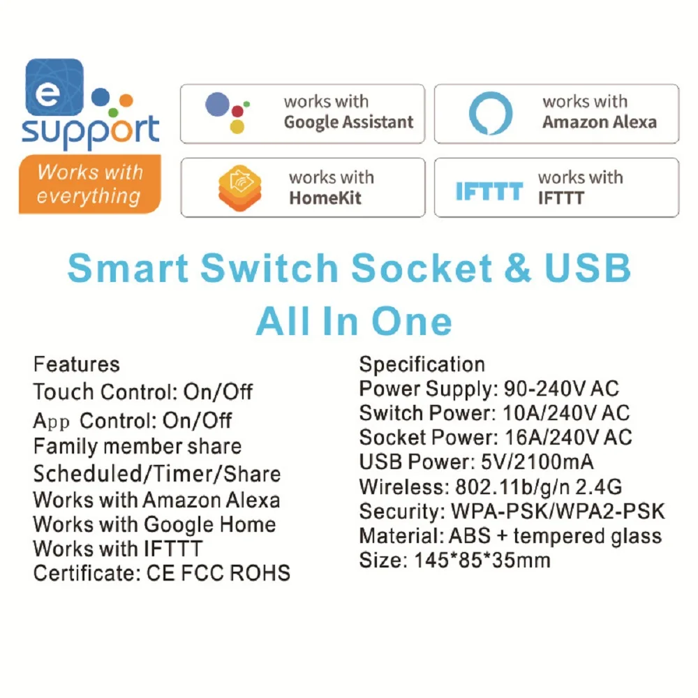 -- Размер продукта: 146x86x35 мм -Цвет: белый/черный -Система: Поддержка IOS 8,0/Android4.0 и выше -- Стандарт WI-FI: 802.11bgn 2,4 ГГц -- Материал: АБС огнестойкий -- Материал панели: закаленное стекло -- Вход Напряжение: AC90-240V 50 / 60hz