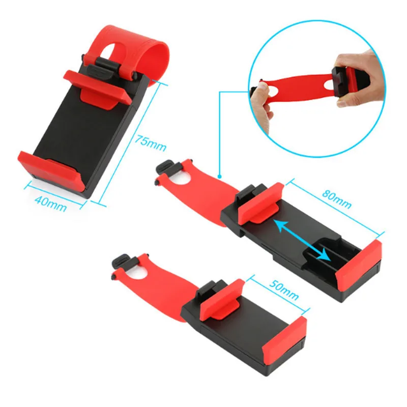 Материал: силикон + АБСРазмер изделия: 75x40 ммШирина держателя телефона: 50 ~ 80 ммВес нетто: 37 гПосылка:1 x Автомобильный зажим рулевого колеса держатель
