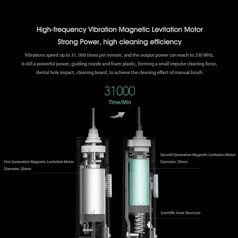 -Высокая частота очистки, скорость вибрации до31000 раз в минуту.