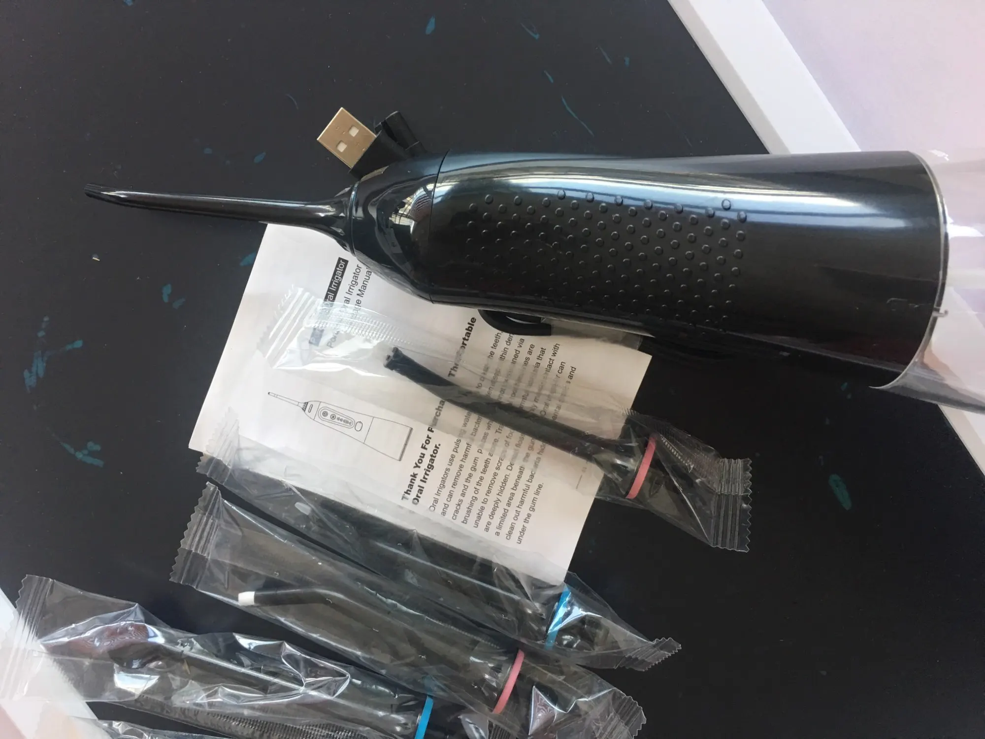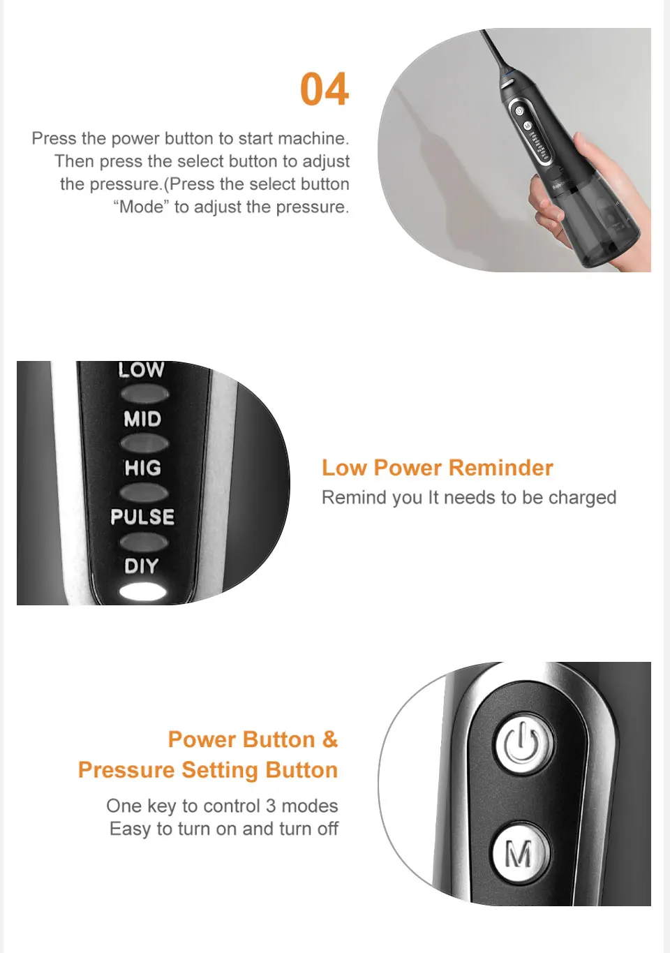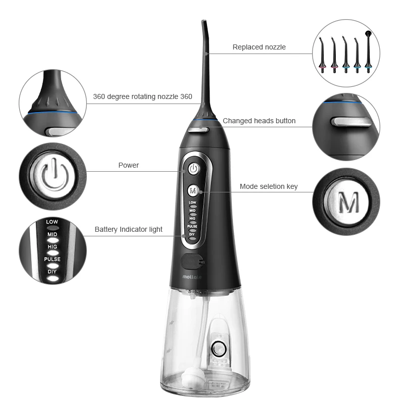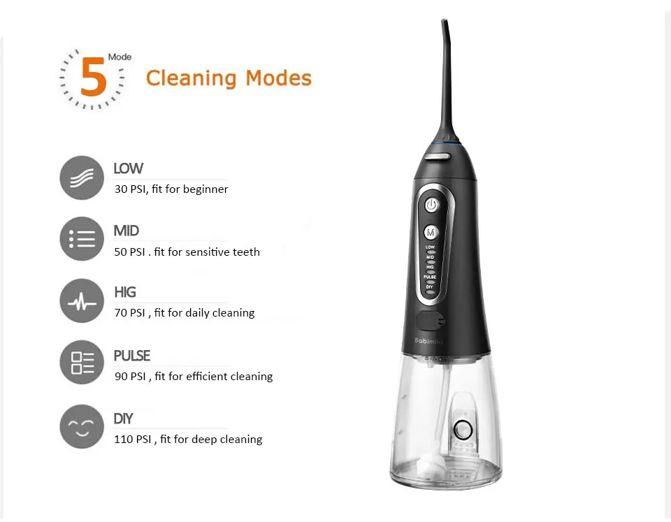 Ваш рот является воротничком для вашего общего здоровья, поэтому важно поддерживать здоровье десен.Используя оптимальное сочетание давления и пульсации, Mornwell F18 Удаляет налет и частицы пищи из скоб и проводов, а также массирует и стимулирует десны. Эти действия помогают уменьшить налет на зубах и вокруг аппаратных средств, а также улучшить здоровье десен.Бесплатная доставка 5 режимов ирригатор для полости рта USB перезаряжаемая водяная нить переносная зубная Вода Flosser Jet 300 мл ирригатор зубные зубы очиститель + 6x насадкиТеплые советы:1. Пожалуйста, внимательно прочитайте все инструкции перед использованием2. Если вы хотите использовать с водой, полосками для полоскания рта или антибактериальными полосками, Следуйте рекомендациям ваших стоматологов или гигиенистов3. Не обращайте внимания на глаза при включении ирригатора полости ртаХарактеристики Товара1. Название продукта: 100% новый бренд ирригатор полости рта для взрослых2. Модель: D3013. Материал корпуса: 100% высококачественный АБС-пластик4. Материал резервуара для воды: 100% высококачественный ПК5. Характеристики: многофункциональный al / IPX7 водонепроницаемый/3 регулируемых режима работы/сильное давление воды/удобная портативная USB зарядка/Съемная большая емкость 200 мл резервуар для воды/5 x различных функциональных насадок, 1 x щетка для очистки/вращающиеся насадки на 360 °/уникальный дизайн гравитационного шарика/Водонепроницаемая вилка и пылезащитная вилка6. Сертификация: CE / FC / FDA7. Входное напряжение адаптера питания: Совместимо с мировым напряжением (100-240 В)8. Вход: 5 В/1 а постоянного тока9. Выход: 3,7 V / 5 Вт10. Частота: 50 / 60 Гц11. Тип резервуара для воды: Съемный большой объем 300 мл резервуар для воды12. Частота импульса: 1400 раз/мин13. Диапазон давления воды: 40-90 PSI14. Тип батареи: перезаряжаемая литиевая батарея 1400 мАч15. Режим зарядки: удобная портативная зарядка через USB16. Время зарядки: 8 часов17. Время работы полностью заряжено: 15 дней (работает два раза каждый день) или непрерывная работа 60 минут18. Размер посылка: приблизительно 28 см x 7 см x 9 см19. Вес посылка: около 0,48 кгПосылка включает в себя:1 x ирригатор для полости рта (без насадок)6 сменных насадок1 x usb-кабель для зарядки (адаптер питания не входит в комплект)Руководство по эксплуатации-1 шт.1 x коробка для посылка