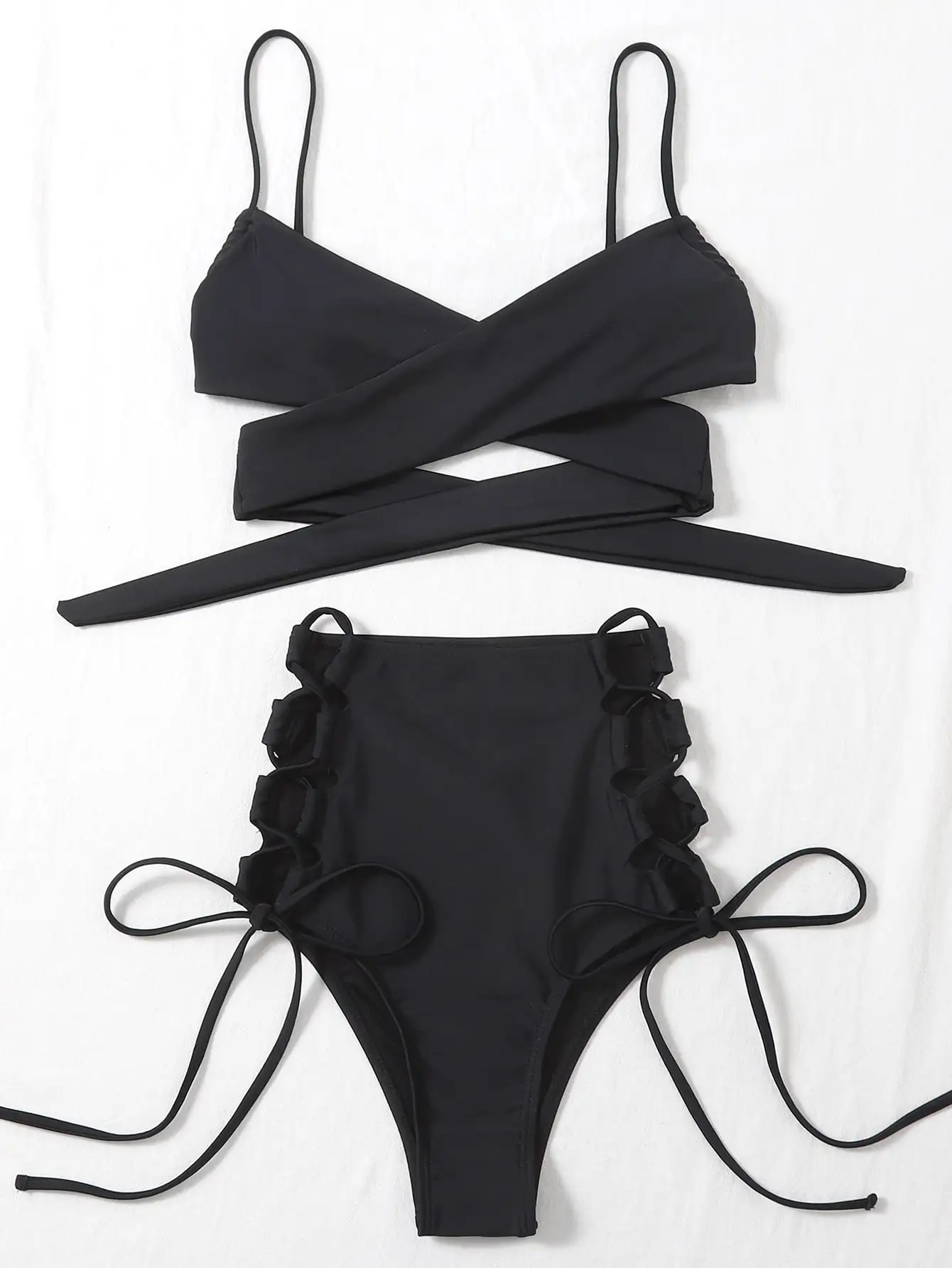 Сексуальное черное бикини с перекрестными бретелями, женский купальник, купальники с высокой талией, кружевная Женская пляжная одежда