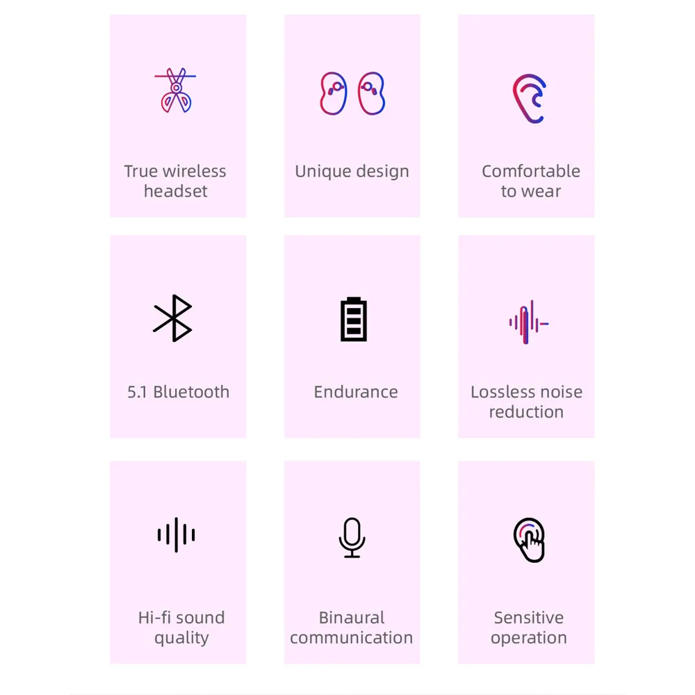 Антенна: встроенная антеннаВерсия Bluetooth: 5,1Антенна: керамическая антенна;Аккумулятор: гарнитура 33 мАч/зарядный отсек 200 мАчПлата защиты батареи: с двойной МОП-чипом батареи защитные наушники время зарядки около 40 минутВремя зарядки зарядного устройства: около 2 часовВремя работы наушников: около 3 часовКоличество раз, когда можно заряжать зарядную коробку, составляет около 3 раз. Нормальное расстояние разговора составляет около 10 метров.Воспроизведение музыки на расстоянии около 10 метровМаксимальное расстояние связи составляет около 12 метровНажмите и удерживайте многофункциональную кнопку в течение 1 секундыВыключение питания нажмите и удерживайте многофункциональную кнопку в течение 3 секундСопряжение автоматически переходит в режим сопряжения после включения питанияАвтоматическое подключение после включения нажмите многофункциональную кнопку в течение 3 секундДважды щелкните последний номер R, чтобы повторно набрать циферблат, дважды нажмите многофункциональную кнопкуКороткое нажатие многофункциональной кнопки отмены набора номераПовесьте короткое нажатие многофункциональной кнопкиОтвет на входящий вызов короткое нажатие Многофункциональная кнопкаВходящий вызов отклоняется долго нажмите многофункциональную кнопку в течение 2 секундДважды нажмите L на следующую песню, дважды щелкните многофункциональную кнопкуНажмите многофункциональную кнопку Pause/PlayЗарядный отсек * 1Наушники * 2Руководство * 1Линия передачи данных * 1Блистер * 1Изысканная упаковочная коробка * 1