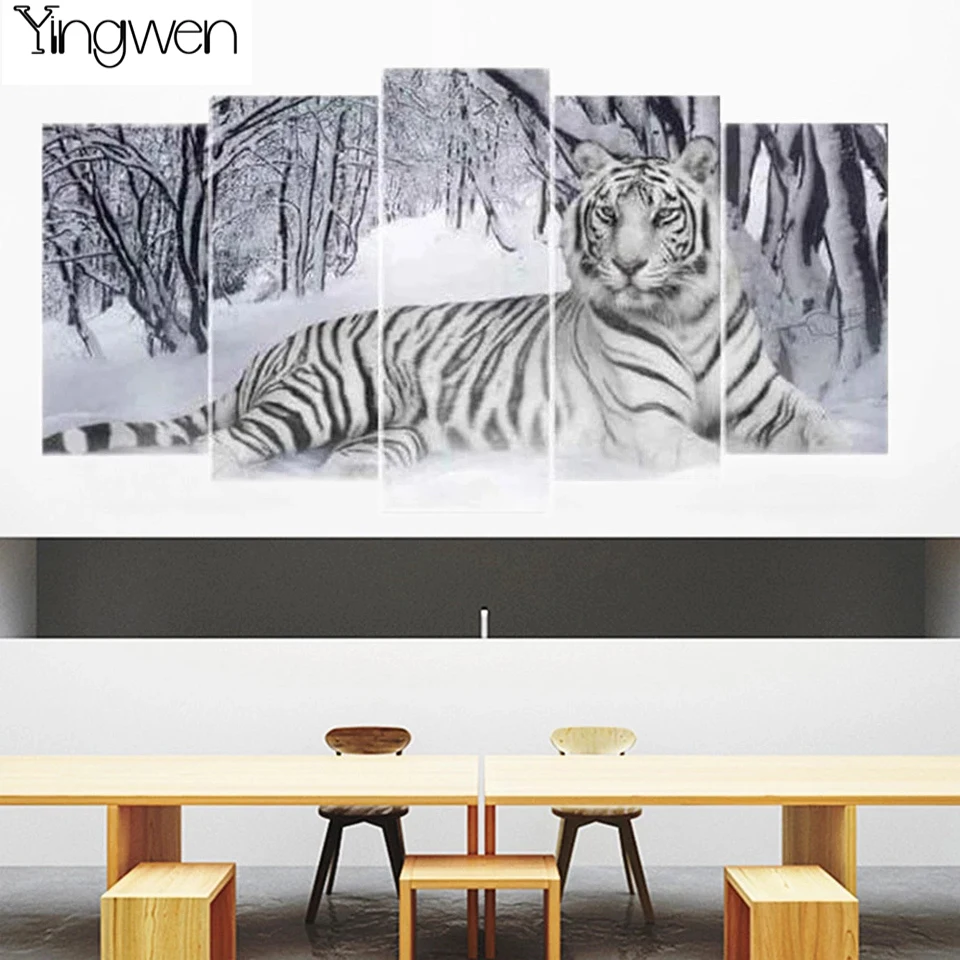 Алмазная картина 5D сделай сам, картина с изображением белого тигра, вышивка крестиком, стразы, 5 панелей, Декор