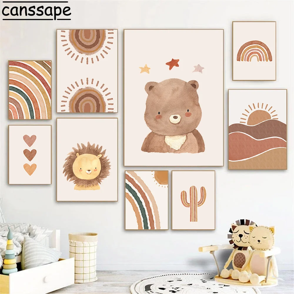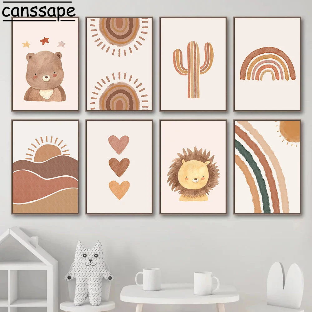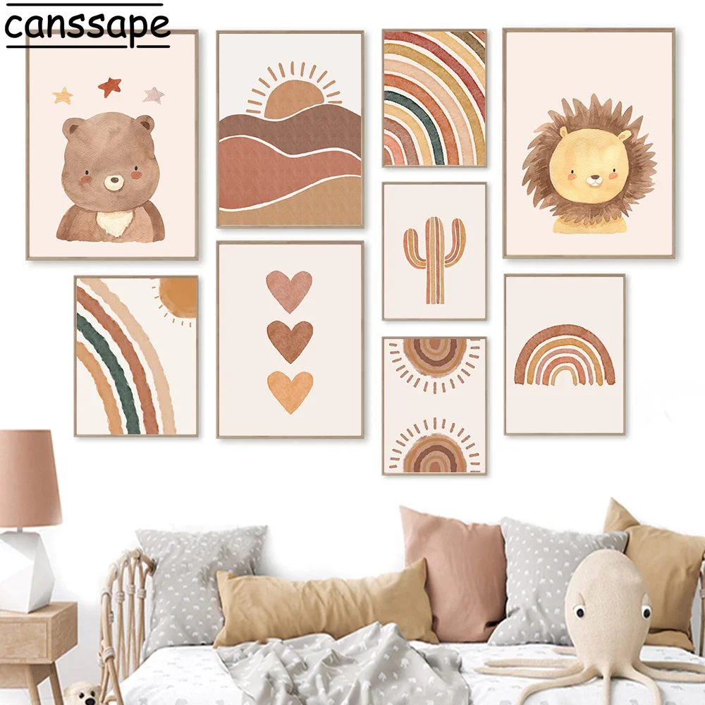 Настенный постер для детской комнаты с изображением медведя льва радуги картины сердца плакаты кактуса печать на стене в стиле бохо декор для детской спальни
