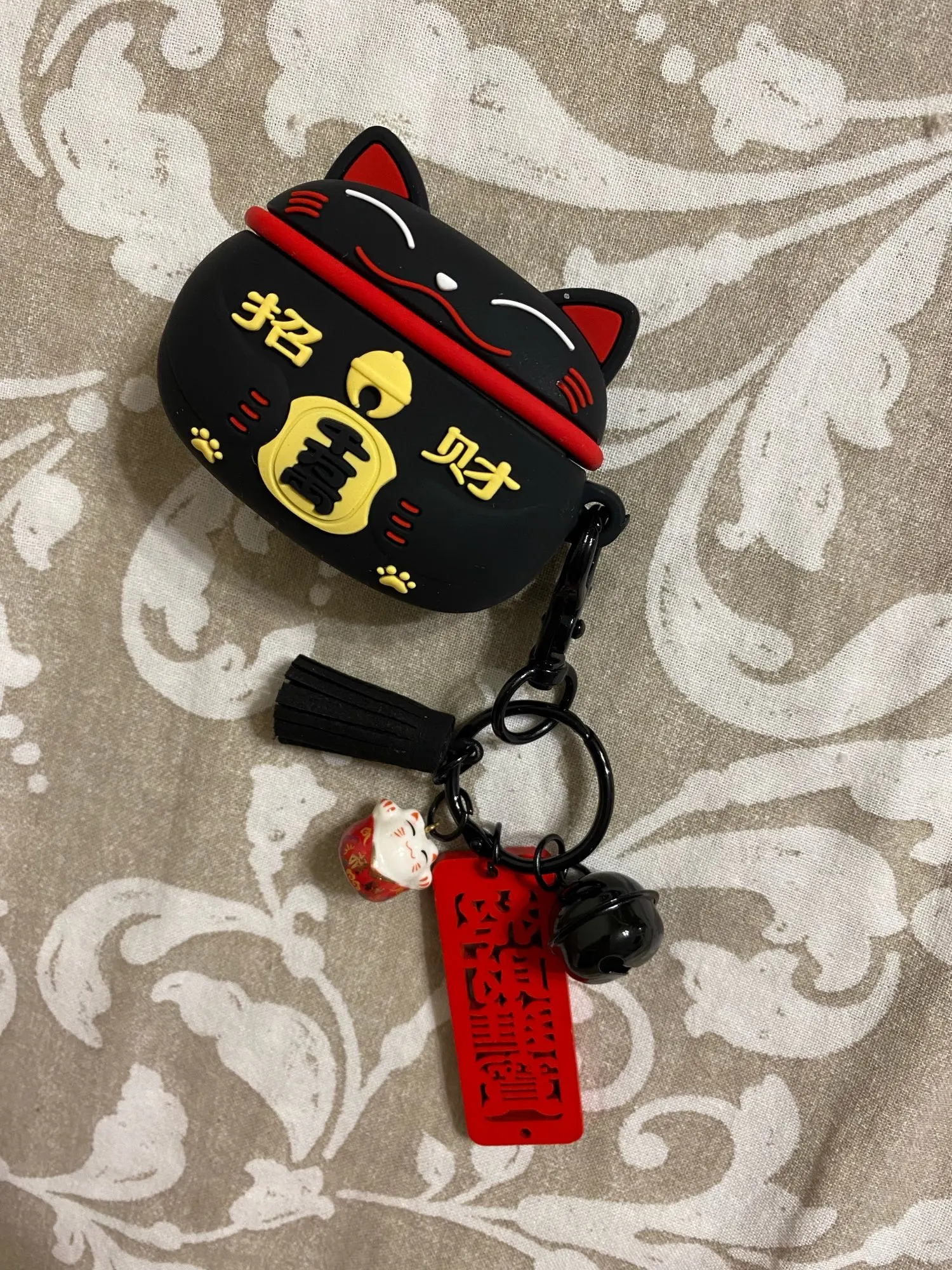 Тактильно очень приятный чехол, сидит добротно, но мне кажется, что будет сползать. Поюзаю и узнаю наверняка. Брелок-котик керамический,брелок-надпись деревянная дощечка, чёрный брелок-бубенчик железный(оч громко бренчит,кошка оценила), брелок-кисточка из плотной ткани,похожей на замшу. Кейс с наушниками теперь намного тяжелее с таким чехлом и брелоками, но мне нравится.