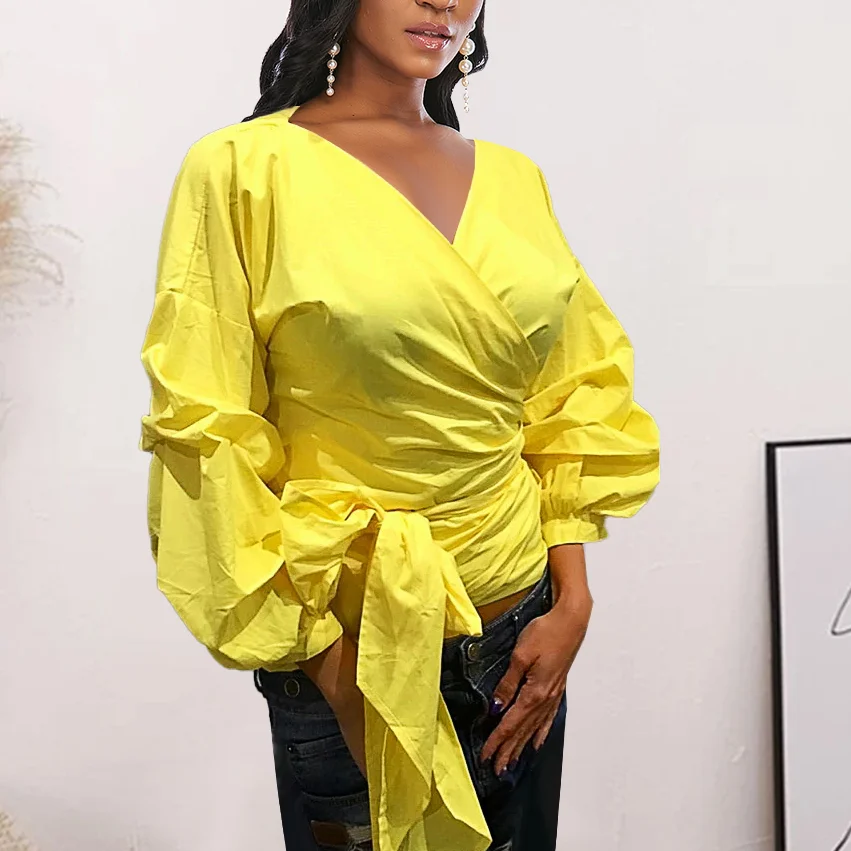 Женская блузка с поясом, повседневная желтая блузка с V-образным вырезом и рукавами-фонариками, со складками, 2021
