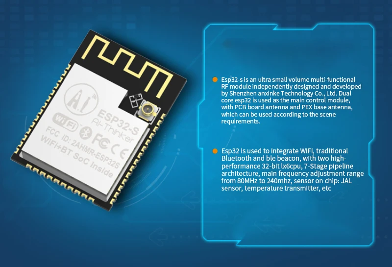 Esp32-s-это ультра-маленький объемный Многофункциональный радиочастотный модуль, независимо разработанный и разработанный Shenzhen anxinke Technology Co, ltd двухъядерный esp32 используется в качестве основного модуля управления с антенной платы PCB и базовой антенной PEx, которая может использоваться в соответствии с требованиями сцены