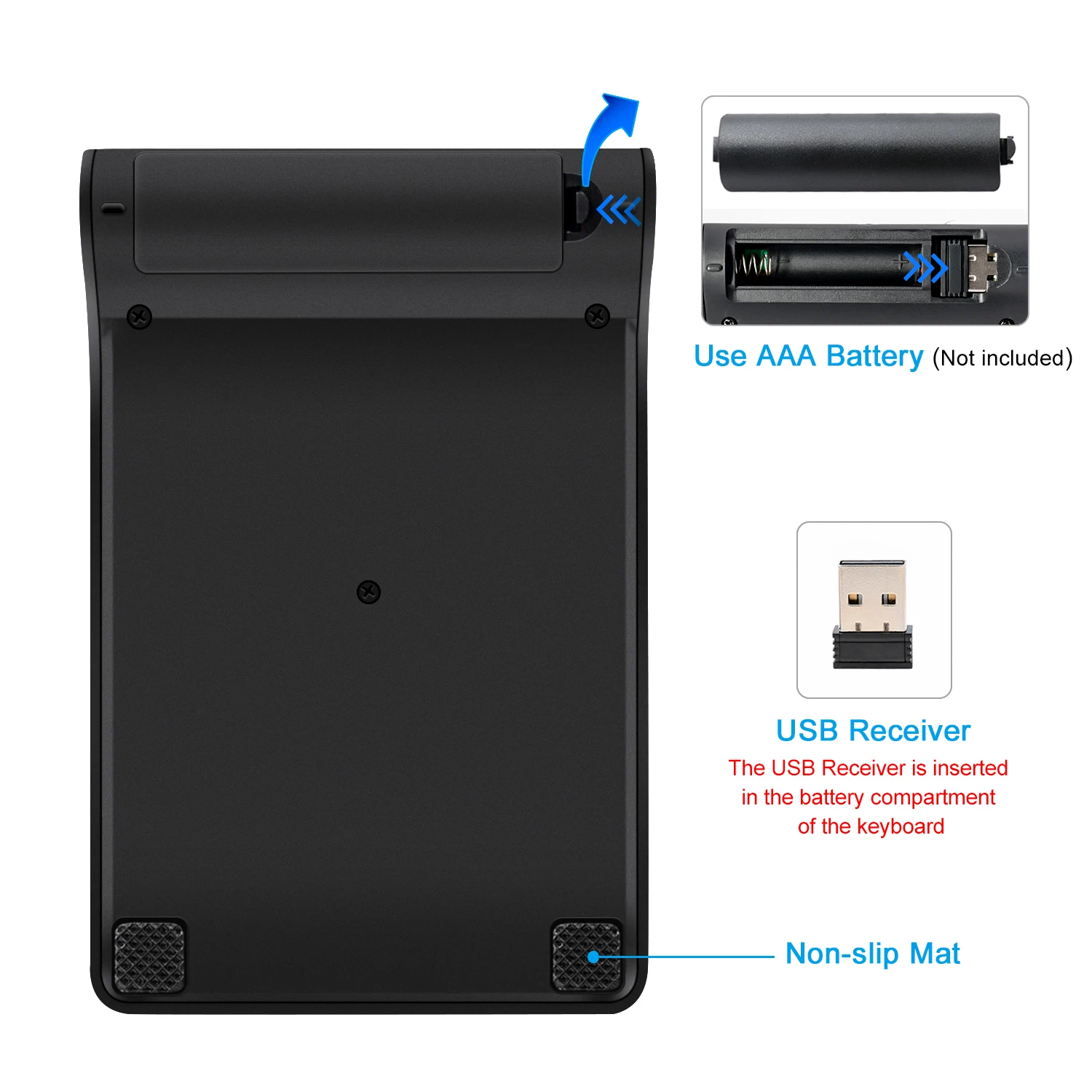 2,4 ГГц Беспроводная связь-подключи и играй, никаких дополнительных драйверов не требуется, стабильность передачи сигнала, рабочим диапазоном до 33ft. (Usb-приемник вставляется в батарейный отсек клавиатуры.)