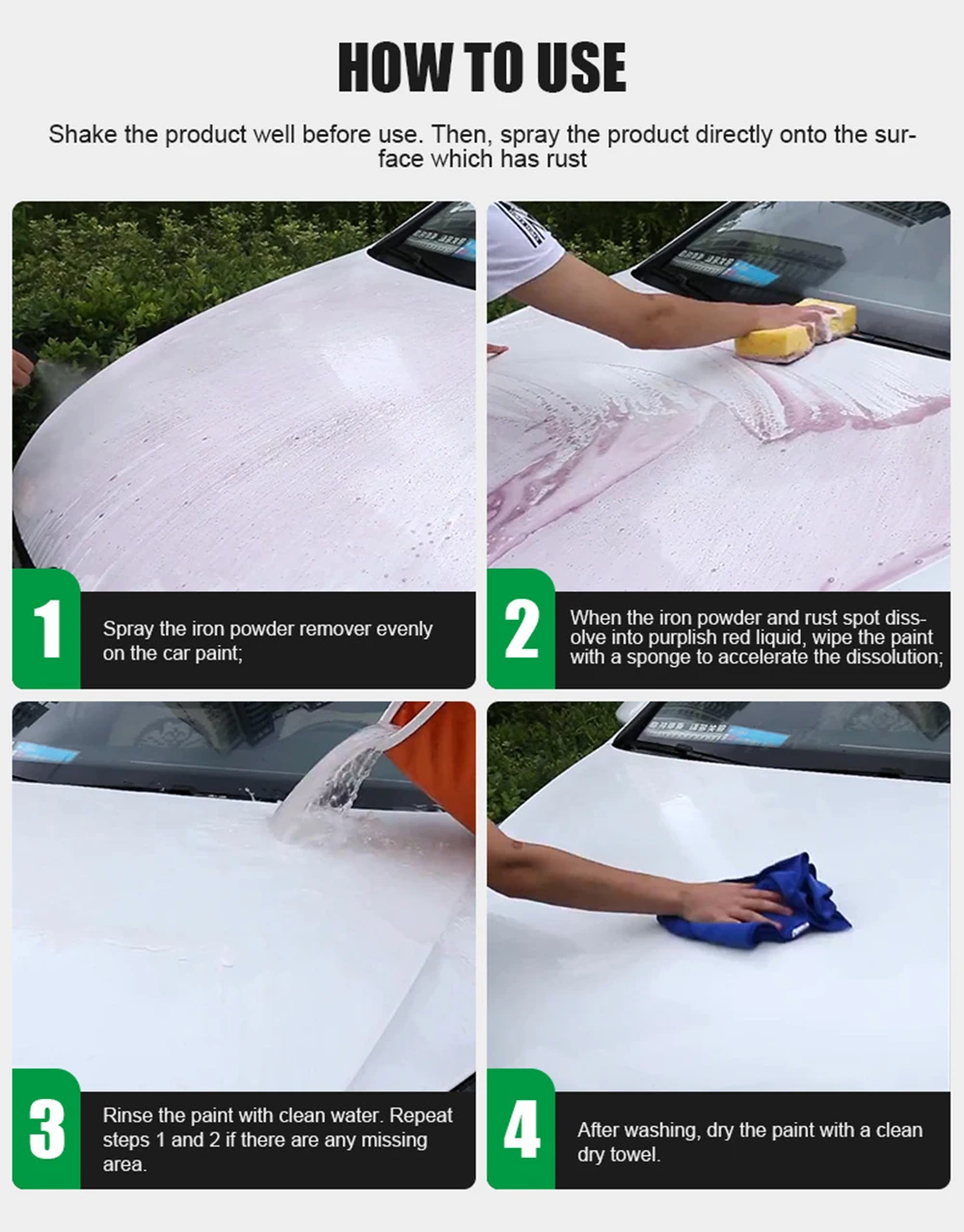 1. Избегайте использования на солнце или при высокой температуре.2. После удаления оксидного слоя поверхности краски рекомендуется воспроизвести краску автомобиля вовремя.