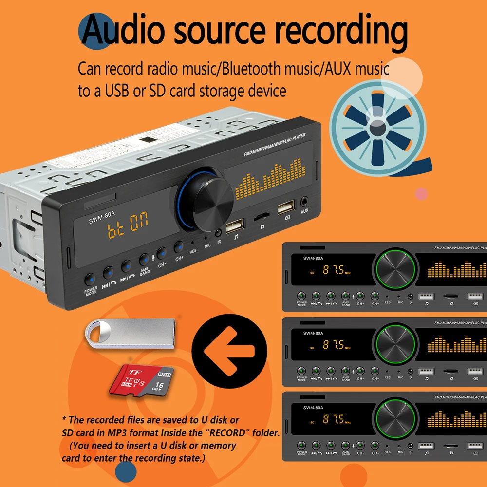 Может записывать радио музыку/Bluetooth музыку/AUX музыку на USB или SD карты памяти устройства