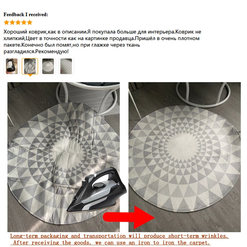 ※Так как ковер будет иметь складки после длительной транспортировки, вы можете использовать швейную гладильную машину для устранения складок. Вы можете ознакомиться с нашим видео.