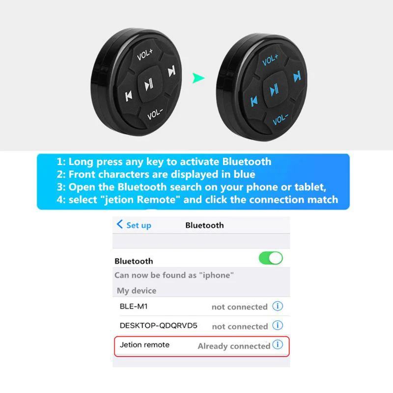 100% новый товар высокого качества.Особенности:Легко устанавливать и разбирать.Применимо к большинству магазинов с функцией управления направлением DVD-навигации.Этот контроллер универсальный, вам не нужно снимать оригинальный руль, чтобы он заработал.Во время воспроизведения музыки в автомобиле вы можете регулировать громкость или переключать песни, не поднимая телефон, что делает вождение более безопасным.После подключения телефона к Bluetooth нажмите кнопку громкости, чтобы удаленно управлять затвором камеры и сделать более естественное изображение.Этот контроллер легко устанавливается на рулевое колесо по своему усмотрению и обеспечивает безопасность вождения.Его можно подключить только к bluetooth мобильный телефон, а не к автомобилю.ТОЛЬКО пульт дистанционного управления, другие демонстрационные аксессуары на картинке в комплект не входят.Характеристики:Тип товара: беспроводной пульт дистанционного управления BluetoothМатериал: АБСДиаметр: 38 мм/1,50 дюймаЦвет: черныйКоличество: 1 шт.Форма: круглаяКоличество кнопок: 5 кнопокФункции кнопок включают: песню Prev, следующую песню, Vol-/Vol +, воспроизведение/пауза.Источник питания приемника контроллера: 12 В постоянного токаРабочая температура: -20 ℃ ~ 85 ℃Версия Bluetooth: Bluetooth 4,2Расстояние колебания: ✮10 мТип батареи: CR 2032 (в комплекте)Инструкции по установке:1. Нажмите и удерживайте любую кнопку, чтобы активировать функцию bluetooth.2. Передние символы отображаются синим цветом.3. Откройте поиск по bluetooth на вашем телефоне или планшете, выберите «Jetion Remote» и нажмите ссылку для совпадения.Примечание:Его можно подключить только к bluetooth мобильный телефон, а не к автомобилю.Допускается погрешность в 0-1 мм из-за ручного измерения, пожалуйста, убедитесь, что вы не возражаете, прежде чем сделать заказ.Из-за разницы между мониторами изображение может не отражать реальный цвет изделия. Спасибо!Посылка входит:1 х пульт дистанционного управления1 х упаковочная коробка