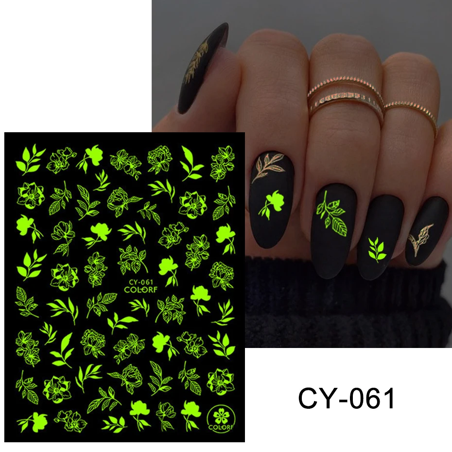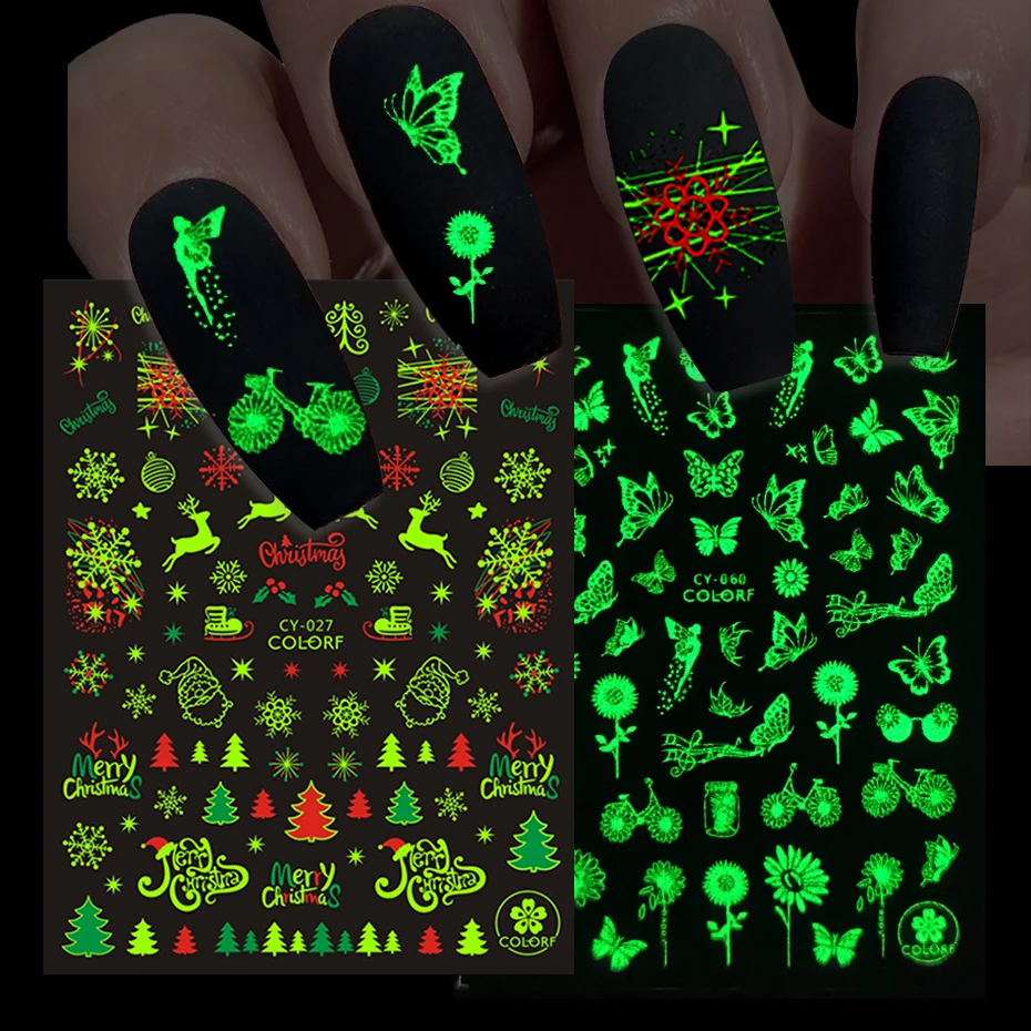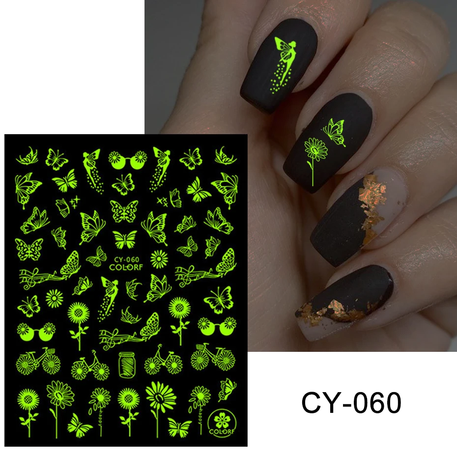 Светящиеся наклейки в виде листьев бабочки для ногтей флуоресцентные цветочные солнцезащитные ползунки для ногтей очаровательные Светящиеся в темноте наклейки для маникюра BECY-019
