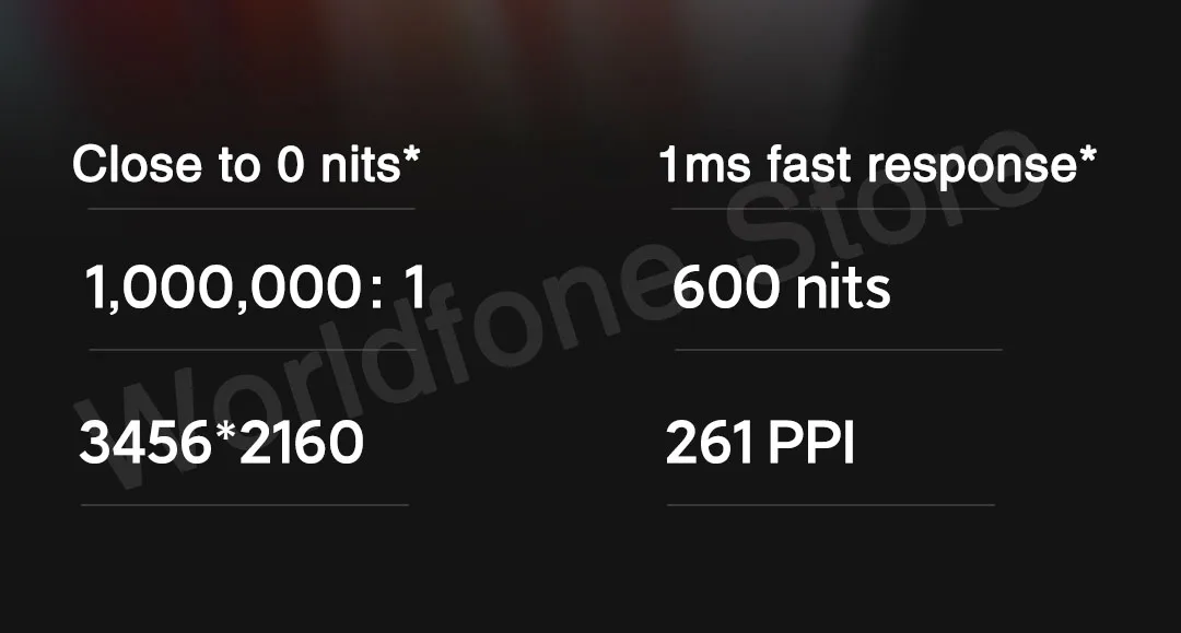 15,6 "OLED супер Retina полный ЭкранРазрешение 3456x2160261PPI, 4,03 мм узкий ободок *, 91% соотношение между экраном и корпусом *16:10 соотношение дисплея, зеркальное защитное стекло, угол обзора 170 °,600 нит пиковая яркость, 1000000:1 Коэффициент контрастности (типичное значение),100% sRGB цветовая гамма/100% DCI-P3 цветовая гамма, Поддержка DC затемнения,Прошел TüV Rheinland Уровень оборудования низкий синий светильник сертификации