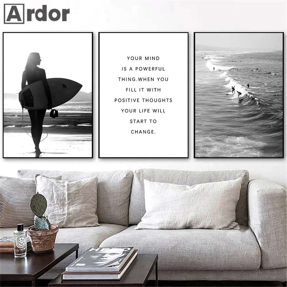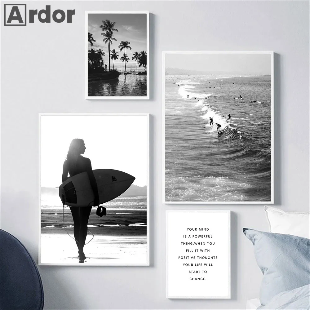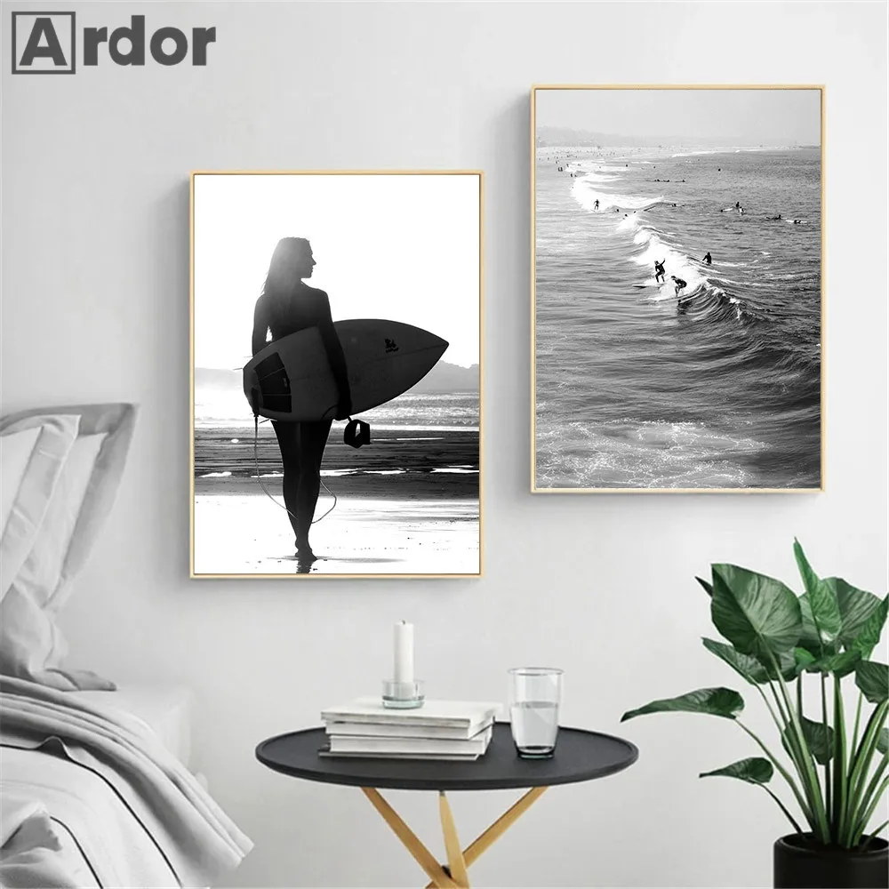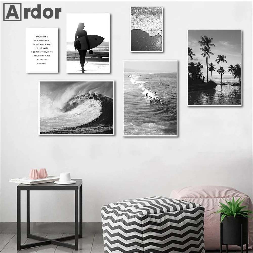 Черно-белый океан, холст, плакат, морская волна, природный пейзаж, Настенная картина, рисунок, серфинг, скандинавские настенные картины, декор для гостиной