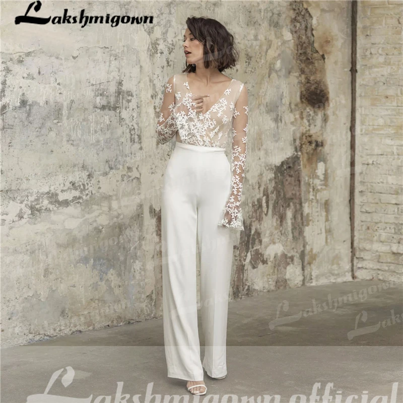 Женский кружевной комбинезон из тюля, расклешенный комбинезон с длинными рукавами и V-образным вырезом, с аппликациями, 2022