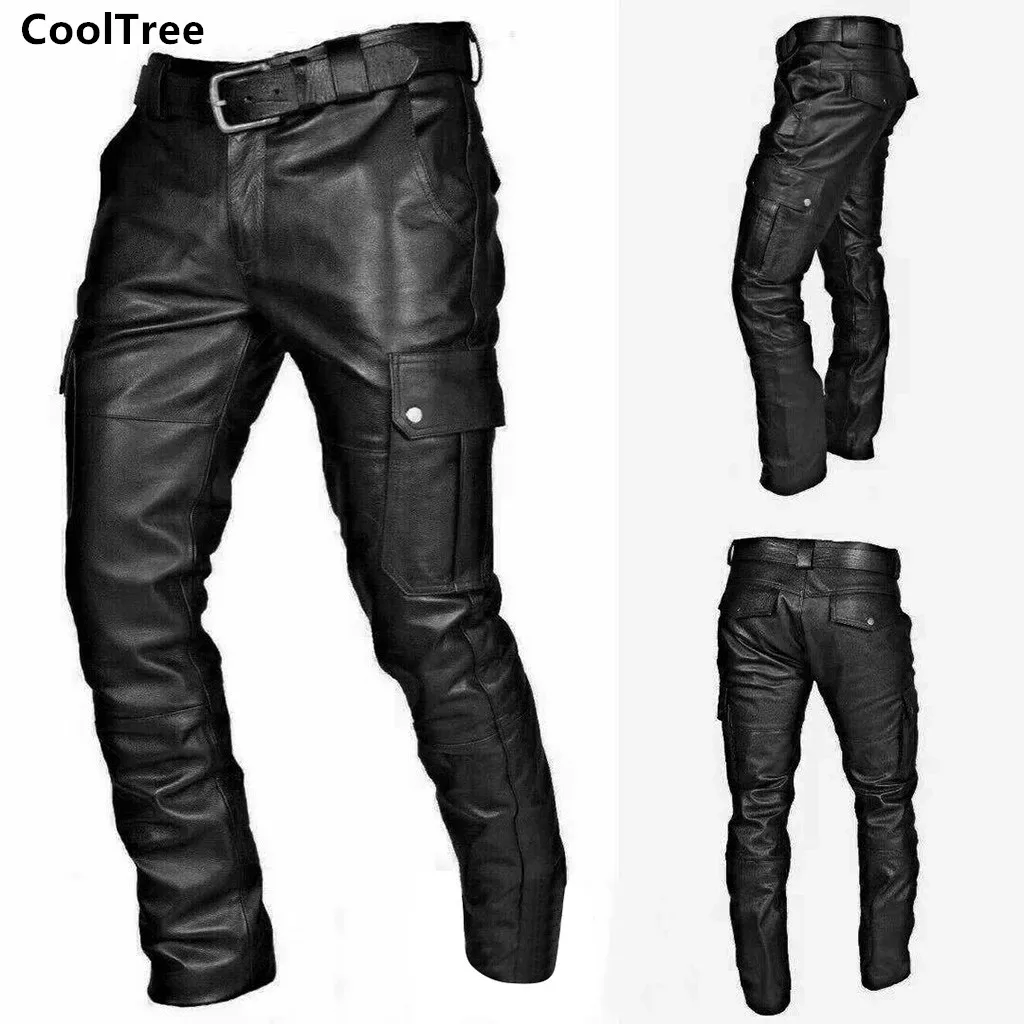 Мужские кожаные брюки CoolTree, весенне-осенние черные повседневные брюки из искусственной кожи с несколькими карманами, мужские облегающие кожаные брюки в стиле ретро панк и Готика